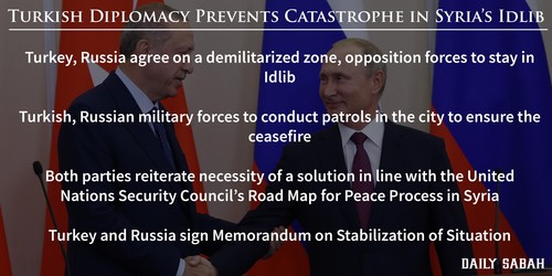 President Recep Tayyip Erdoğan and Russian President Vladimir Putin announced yesterday, following their meeting in Sochi, that they have agreed on establishing a 15-to-20-kilometer-wide demilitarized zone in the opposition enclave of Idlib, Syria, which will be patrolled by Turkish and Russian forces, as of Oct. 15. "By Oct.15, we will establish a demilitarized zone in Idlib in an area that is 15 to 20 kilometers wide. The armed opposition groups, including the Nusra Front [Hayat Tahrir al-Sham] will retreat from the region, as well as the heavy weapons," Putin said during a joint press conference following the meeting, adding that there will also be a joint monitoring mechanism comprising of Russian and Turkish soldiers. Erdoğan also confirmed the decision on establishing the demilitarized zone between the opposition and the regime forces.