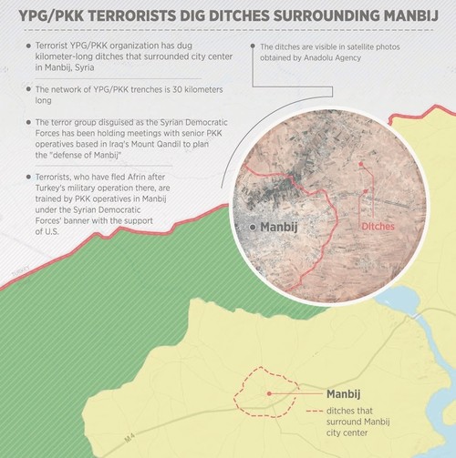Yet, according to recent media reports, the YPG, the PKK terrorist group's Syrian affiliate, is planning to retain its control over the city and has been preparing for a likely Turkish operation since July, despite the Manbij agreement. Satellite pictures of the city revealed that YPG forces dug 29.3 kilometers of ditches around the city. The terrorist organization controls the city's entries and departures through these ditches. Tunnels linking the ditches enable the group to move freely.