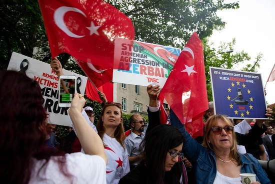 "Terrorist Yerevan, stop lying Armenia," chanted demonstrators against their rival counterparts, accompanied by Turkish songs.