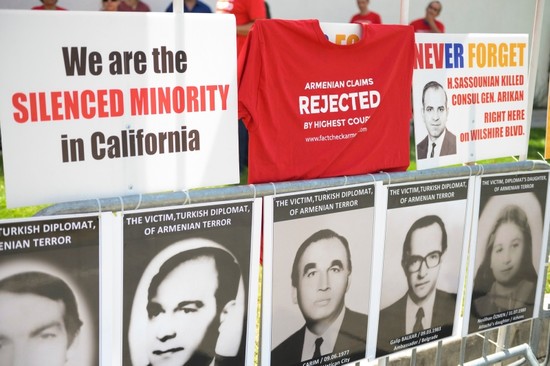 Turks display the photos of diplomats assassinated by Armenian militant groups during a counter-protest in front of the Turkish consulate in Los Angeles, April 24, 2019. (IHA Photo)
