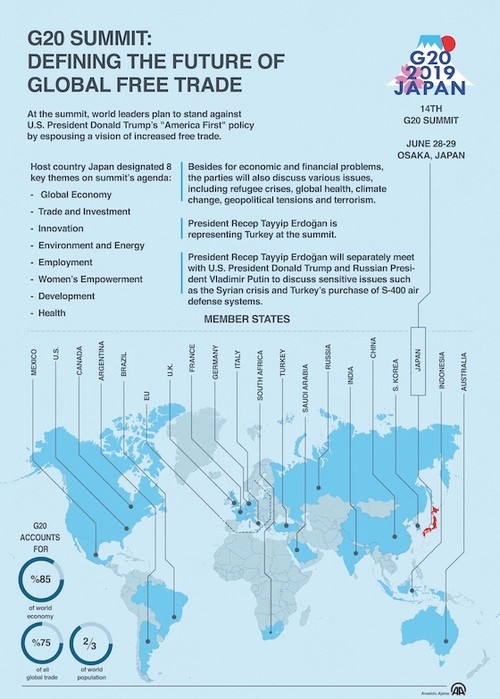Japanese Prime Minister Shinzo Abe stressed the need to focus on what unites G20 members and not divides, only too aware of the many differences likely to emerge over 24 hours. "We want the G20 to focus on where we can agree and cooperate rather than highlighting differences," Abe said. The G20, which kicked off Friday in the Japanese town of Osaka, is an annual meeting of leaders from the countries with the largest and fastest-growing economies. Its members account for 85 percent of the world's gross domestic product, and two-thirds of its population. One reason why the countries are having difficulty finding common ground for the resolution of the urgent global issues that yield far-reaching consequences is the fact that they are focused on their own bilateral problems. For the last week, the G20 headlines were, to a great extent, dominated by the U.S.-China trade war, U.S.-Turkey relations strained due to the S-400 missile system, U.S.-Russia issues, Turkey's dialogue with Russia in Syria and the U.S.-Iran conflict, which needs to be addressed by all participating countries.