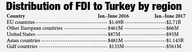 This accounted for 66 percent of the total investment of $4.1 billion that came to Turkey in the same period.