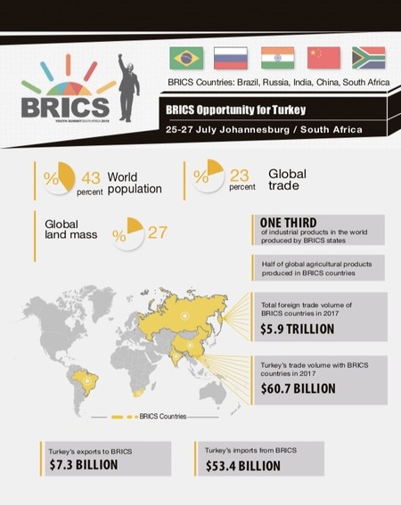 Turkey's trade volume with BRICS countries in 2017 was calculated at $60.7 billion. The country's total exports to the five BRICS members was $7.3 billion, while its imports from these countries hit $53.4 billion.