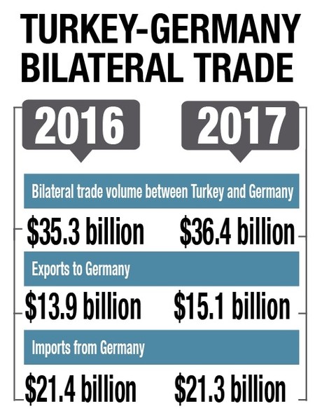 Bilateral trade between Turkey and Germany in 2016 totaled $35 billion. Turkey's exports to Germany amounted to $13.9 billion, while imports were $21.4 billion. Bilateral trade between the countries increased, reaching $36.4 billion in 2017, according to the data compiled by the Turkish Statistical Institute (TurkStat).
