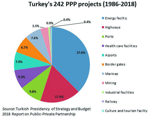 In sectoral breakdown, energy generation facilities came first with 91 projects and were followed by 42 highway projects. Ports ranked first with 23 PPP projects. Some 20 health care facilities, 19 airports, 18 border gates, 17 marinas and tourism facilities, eight mining projects, two industrial facilities, one railway and one culture and tourism facility were among the other PPP projects.