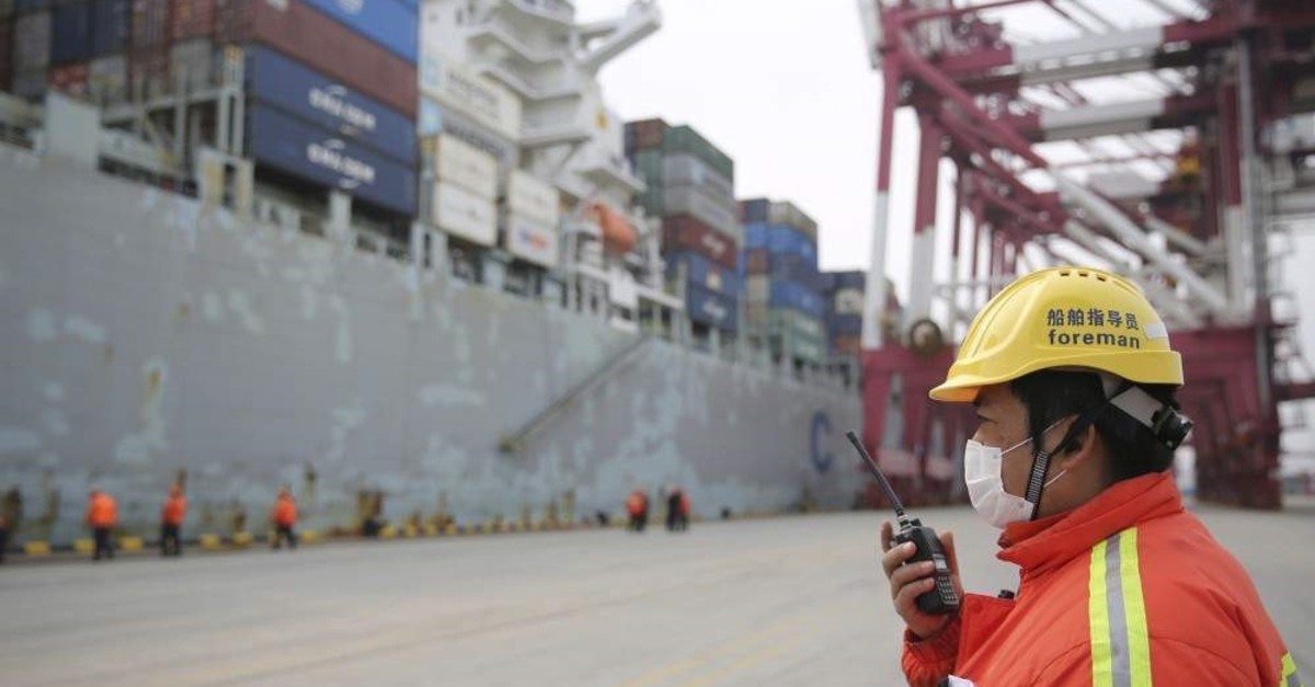 In this Feb. 4, 2020, photo, a foreman wears a face mask as he communicates via radio at a container port in Qingdao in eastern China's Shandong Province. (Chinatopix via AP)