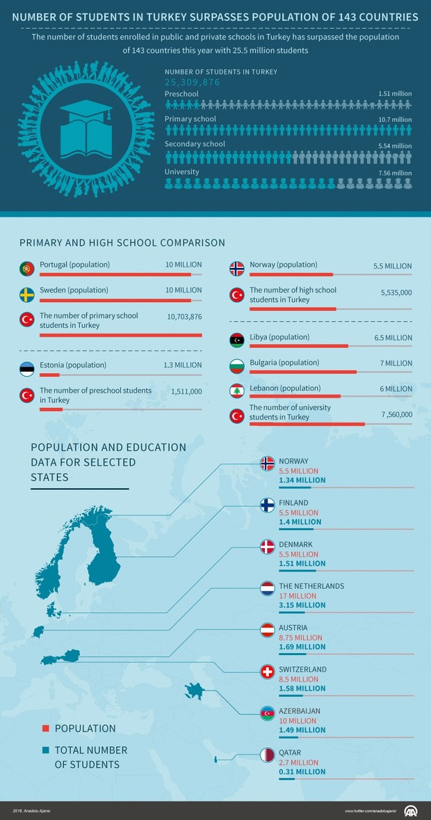 As the first day of the 2017-2018 schoolyear kicked off Monday, figures obtained by Anadolu Agency show that the number of students enrolled in primary school, secondary school and university exceeds the entire population of dozens of countries.