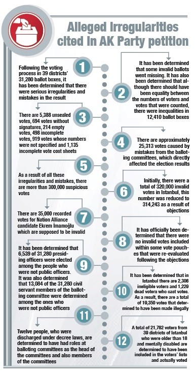 The last item, in particular, has given way to a number of questions. According to the AK Party petition, people from "ineligible" categories, such as military personnel, deceased, convicts, drug or alcohol addicts, or the mentally ill were registered and voted in the elections.