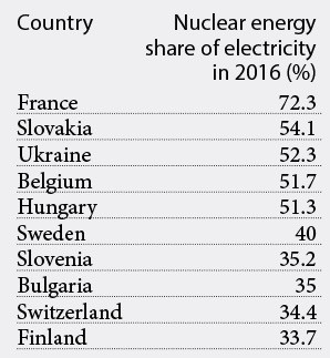 In 2016, France, which has 58 operating reactors, topped the list of countries that generate electricity out of nuclear power with 72.3 percent. Slovakia ranked second and generated 54.1 percent of its total electricity out of nuclear power plants. Nuclear power as a share of electricity in Ukraine, Belgium and Hungary, respectively, corresponded to 52.3, 51.7 and 40 percent of total electricity generation.