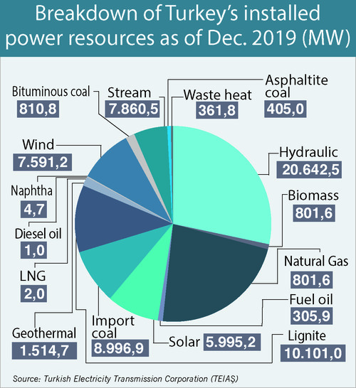 On the generation side, local and renewable resources including solar, wind, geothermal, hydropower and bio-waste, generated more than 44% of the total power, according to the preliminary data compiled from the Ministry of Energy and Natural Resources. The total gross power generation was calculated at 303,674 billion kilowatts per hour. Surprisingly, Turkey's power generation from natural gas drastically dropped to below 20% last year. In 2018, natural gas accounted for nearly 30% of the total power generation, and the figure had stood close to 50% of that amount a decade ago. In fact, for three consecutive years in 2007, 2008 and 2009, half of Turkey's electricity was generated with natural gas.