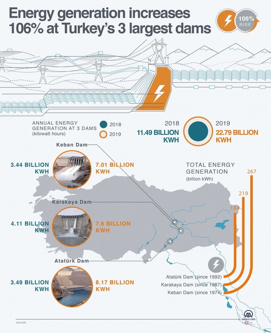 The energy generated at Turkey's three largest hydroelectric power plants – the Atatürk, Karakaya and Keban dams – increased by 106% in 2019 compared to the previous year.