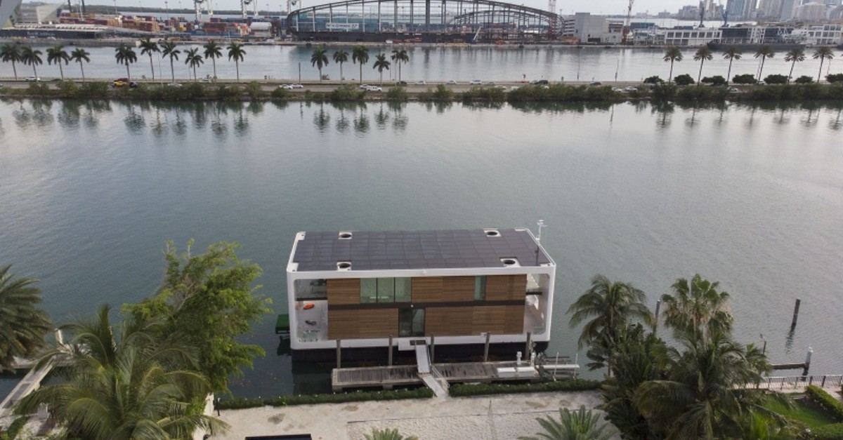 An aerial view from a drone shows the Arkup houseboat, a green-energy luxury floating home that can allow owners to adapt as the sea level continues to rise on May 14, 2019 (AFP Photo)
