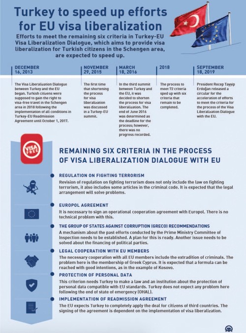 Ankara is getting ready to fulfill the remaining six criteria mandatory for the liberalization of visa restrictions for Turkish citizens within the EU, giving momentum to the related works in the upcoming period. Since Turkey's first application to the European Union back in 1963, the visa liberalization process for Turkish citizens has been a major point and gained even more momentum last year when Ankara set out to fulfill the 72 criteria being levied on them. Now, almost a year later, an overwhelming majority of these criteria have been achieved. The remaining six criteria are expected to be fulfilled in the upcoming few months as the country published a circular Wednesday in the Official Gazette on accelerating efforts.