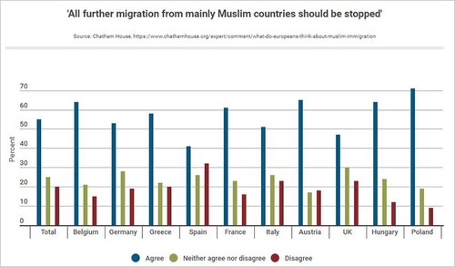 Chatham House noted that Austria, Poland, Hungary, France and Belgium had at least 38 percent of respondents strongly agreeing with the statement, despite these countries having very different sized resident Muslim populations.