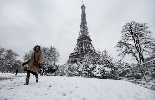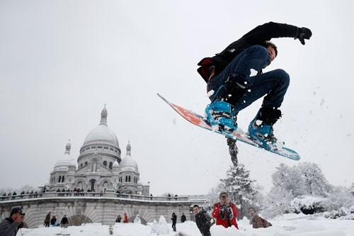 But the wintry weather was a delight for schoolchildren as well as a gaggle of skiers and snowboarders who gathered at the Sacre-Coeur basilica at the top of Montmartre, the hill in the north of the city.