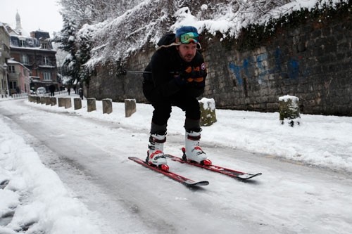Skiers swished down the hilly streets of Montmartre in Paris on Wednesday, taking advantage of heavy snowfall that otherwise spelled misery for thousands of travelers.