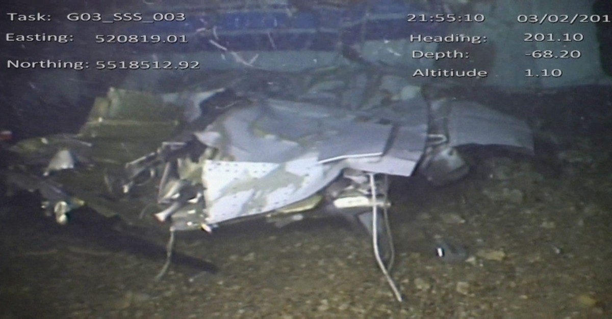This still made from video provided by the Air Accidents Investigation Branch showing the wreckage of the plane which crashed into the Channel on Jan. 21, 2019 killing footballer Emiliano Sala. (AAIB via AP)