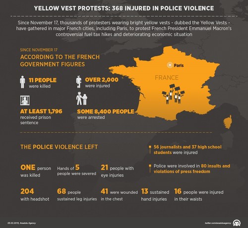 Nearly 370 people were injured since last November, an online investigative French journal said on Tuesday. According to Mediapart, one person was killed and 368 others injured after getting shot by tear gas capsules of French police during anti-government protests. The police violence left 21 people with eye injuries, 204 others with head injuries, as a consequence of the explosion of concussive grenades. Some 68 people sustained leg injuries while 41 others were wounded in the chest. Among those injured were 56 journalists and 37 high school students. The horrifying images of students, outdoors in the suburban city of Mantes La Jolie, on their knees, hands behind their heads had shocked France. They are being watched over by armed police officers whose faces are hidden by ski masks. The yellow vest movement originally started against fuel tax hikes but has snowballed into a wider revolt against a president and government accused of being out-of-touch with ordinary people. The riots were among the worst violence the capital has experienced since a 1968 student uprising. Violent clashes with police have persisted on the fringes of weekly marches in Paris, Toulouse, Bordeaux and other cities.