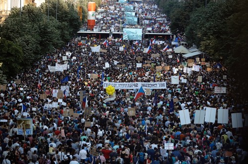 Tens of thousands of protesters filled the streets of Prague on Tuesday to demand the resignation of Prime Minister Andrej Babis, in one of the country's biggest political demonstrations since the fall of communism.