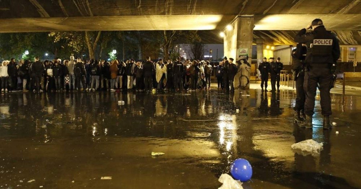 Police officers guard migrants as they clear an area, Paris, Nov. 7, 2019. (AP Photo)