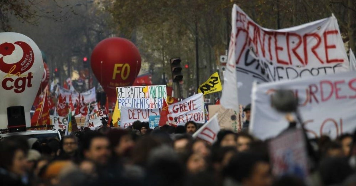 People march during a demonstration, Paris, Dec. 10, 2019. (AP Photo)