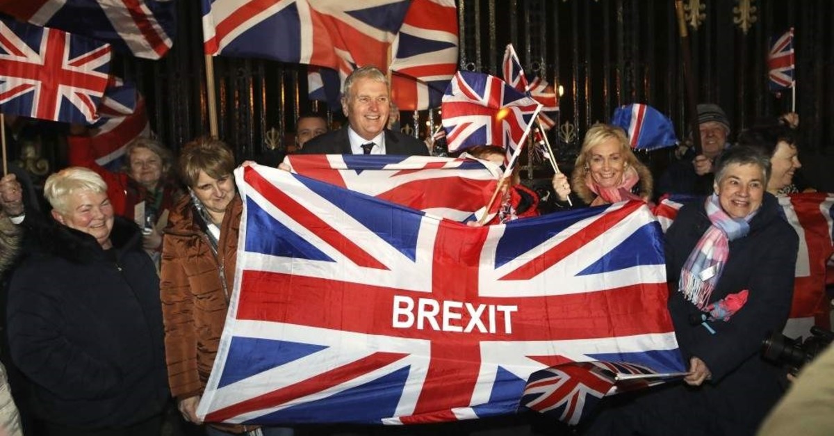 Brexit supporters celebrate during a rally outside Stormont, Belfast, Jan. 31, 2020. (AP Photo)