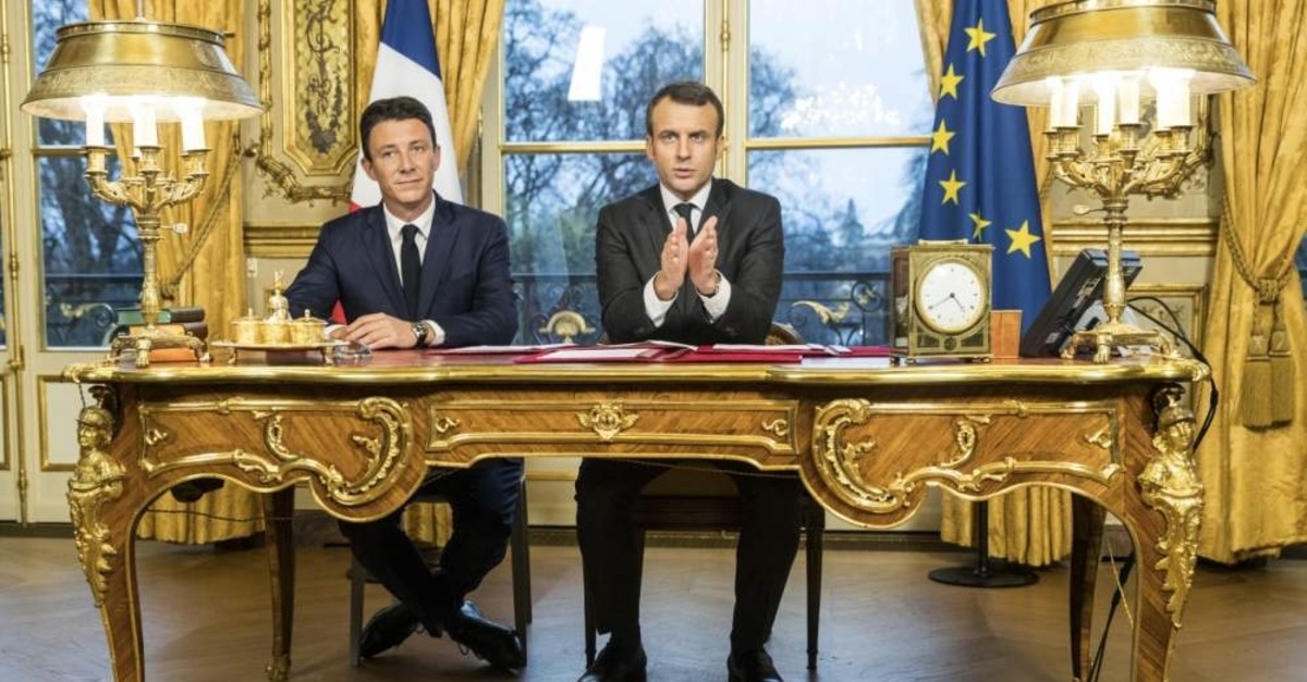 French President Emmanuel Macron delivers a speech next to his former government spokesperson, Benjamin Griveaux, at Elysee Palace, Paris, Dec. 30, 2017. (AP Photo)