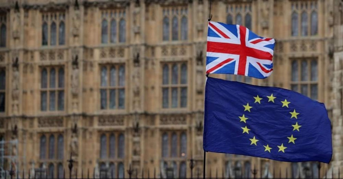 An anti-Brexit activist waves a Union and a European Union flag while demonstrating outside the Houses of Parliament in central London, Jan. 23, 2019. (AFP Photo)