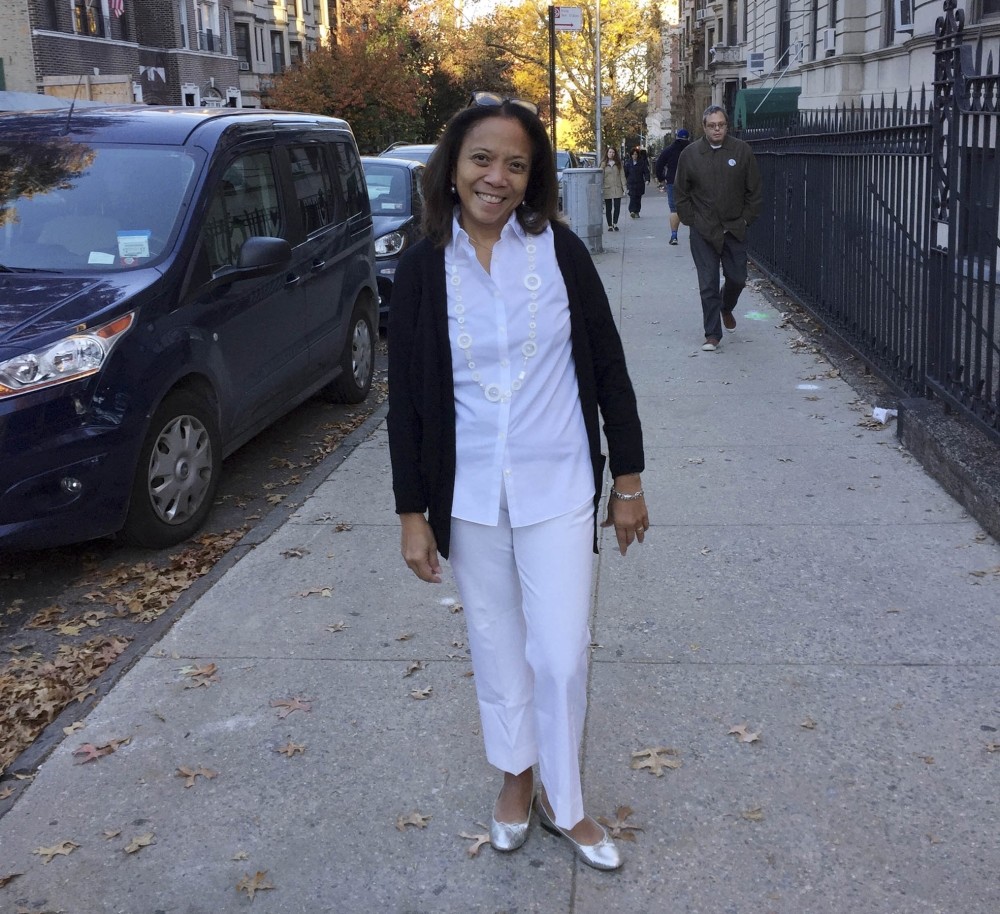 An American woman dressed in white poses near her polling place after voting for Hillary Clinton. Some of Clinton's supporters dressed in white as a tribute to the suffragists.
