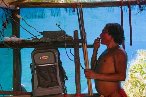 A Waiapi man uses a solar amateur radio to talk to another village at the Waiapi indigenous reserve.