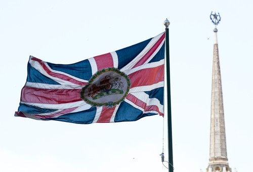 A British flag flutters in front of the British Embassy with the Soviet star in Moscow, Russia.
