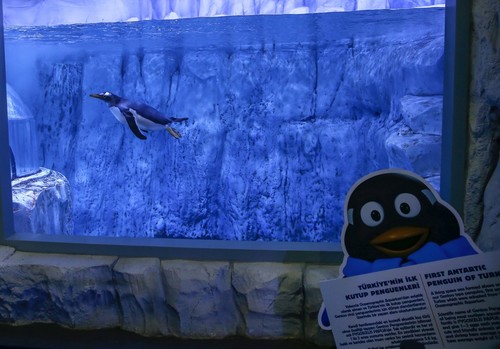Mehmet Mutlu, one of the personnel at the aquarium, is responsible for 12 long-tailed Gentoo penguins. Explaining that they clean the living spaces of the penguins and spread snow around here every morning, Mutlu said, "We check the health of the penguins. We look at whether they have a physical problem or not. Besides, we check their behavior. Then, we deal with their feeding. We give multivitamin complexes to penguins every day. In addition, divers practice the acrylic cleaning of the penguins and also clean waste in the deep."