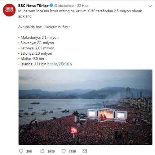 A day before the Ankara rally, İnce held another one in CHP's stronghold of İzmir where, in BBC Turkish's words, "a flood of people" was seen. The CHP announced the attendance as 2.5 million people. The BBC Turkish agreed and shared the information with a note on the Twitter, showing that some European countries such as Macedonia and Slovenia had smaller populations than İnce's İzmir rally in Gündoğan Square.