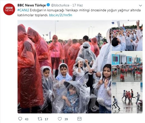 The biggest rally Erdoğan had in Istanbul's Yenikapı Square was the most noticeable example of the BBC Turkish's partiality against him. Unlike the millions-were-there rhetoric it used for İnce's rallies, the news service shared pictures at which people in small numbers wore plastic raincoats, running in a hurry to attend the rally. No long lines of millions, no smiling faces, no bright eyes...