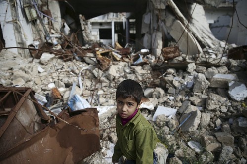 A boy walks along damaged buildings in Eastern Ghouta, Syria.