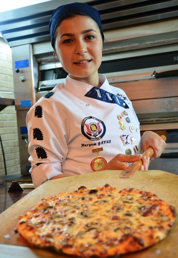 A senior gastronomy student at Çanakkale Onsekiz Mart University's Gökçeada Academy of Applied Sciences, Meryem Yavuz, took the gold medal home at the "1st Pizza Championship," which was organized by Turkey's Union of Pizza Masters and Chefs.