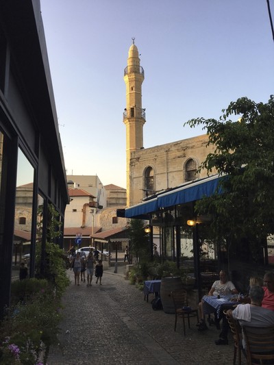 People from all walks of life around the world sit and enjoy the local culinary heritage of former Ottoman Palestine under the shadow of Jaffa's largest mosque, Mahmoudiya, built in the early 19th century.