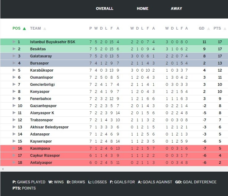 Fenerbahçe currently stand in ninth place on nine points.