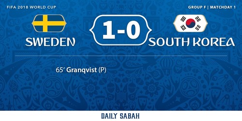 Sweden beat South Korea 1-0 at the World Cup on Monday through a penalty by captain Andreas Granqvist following a video review.