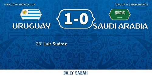 Uruguay striker Luis Suarez scored in the 23rd minute to secure his side's 1-0 victory against Saudi Arabia in their Group A game at Rostov-on-Don on Wednesday.