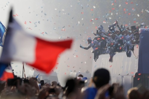 The World Cup-winning French team returned home Monday, parading down the Champs-Elysees as hundreds of thousands of cheering fans gave a raucous welcome to the country's newest idols.