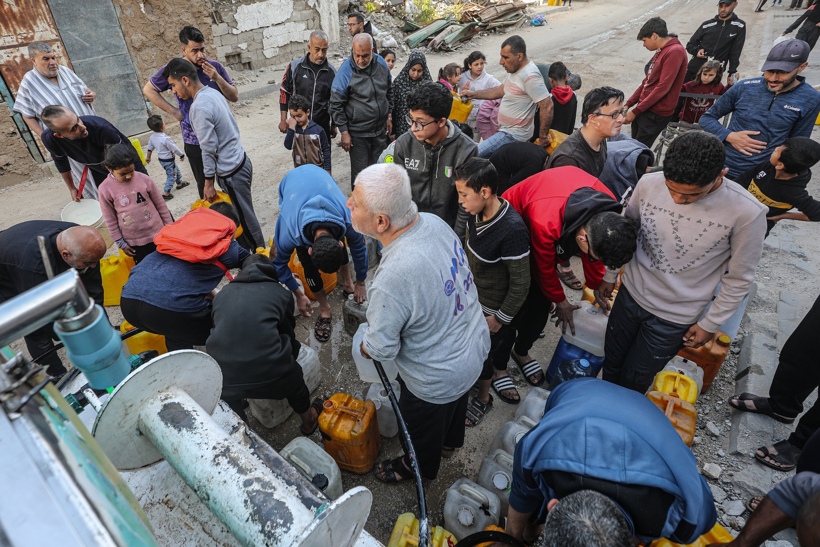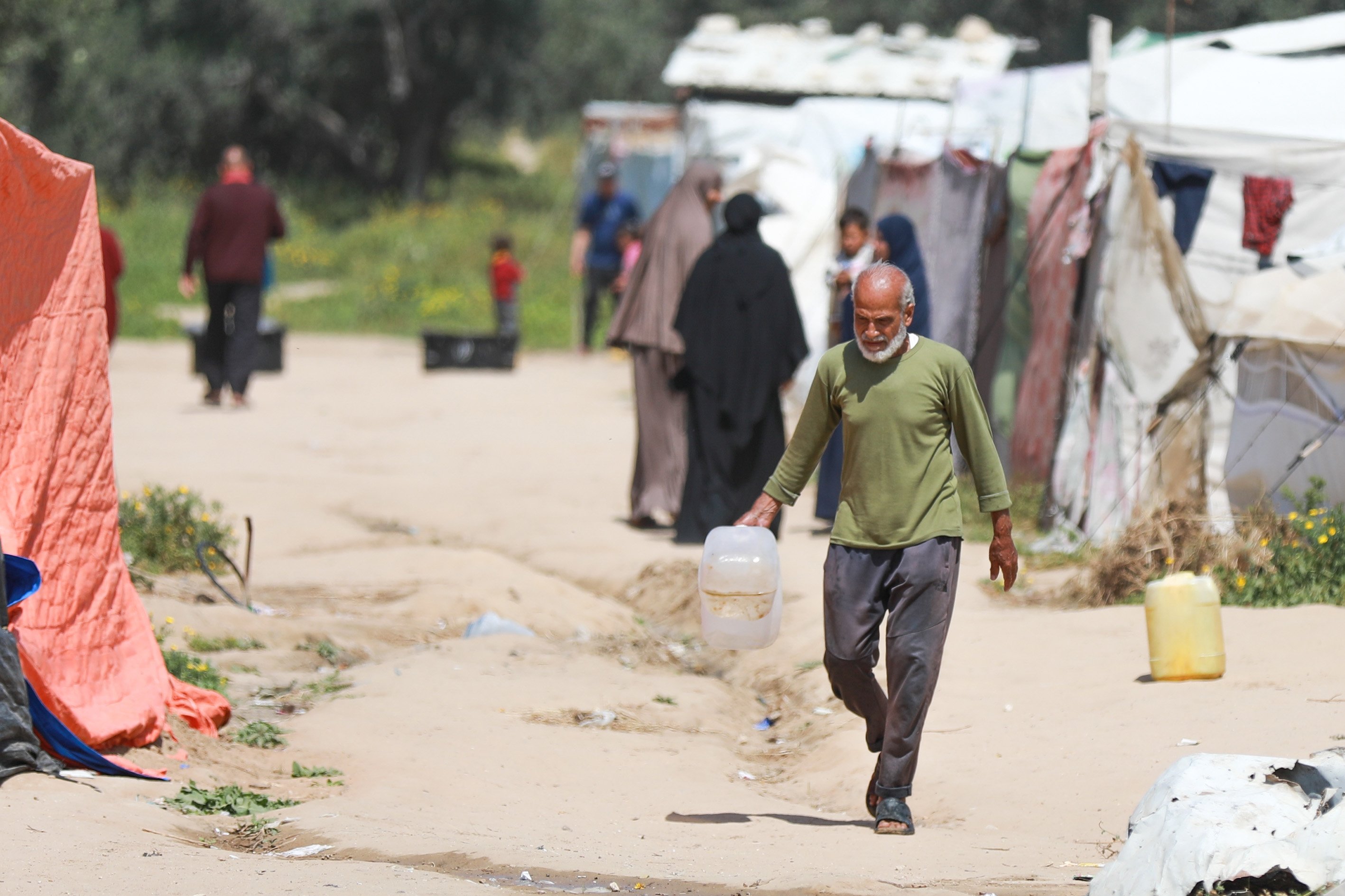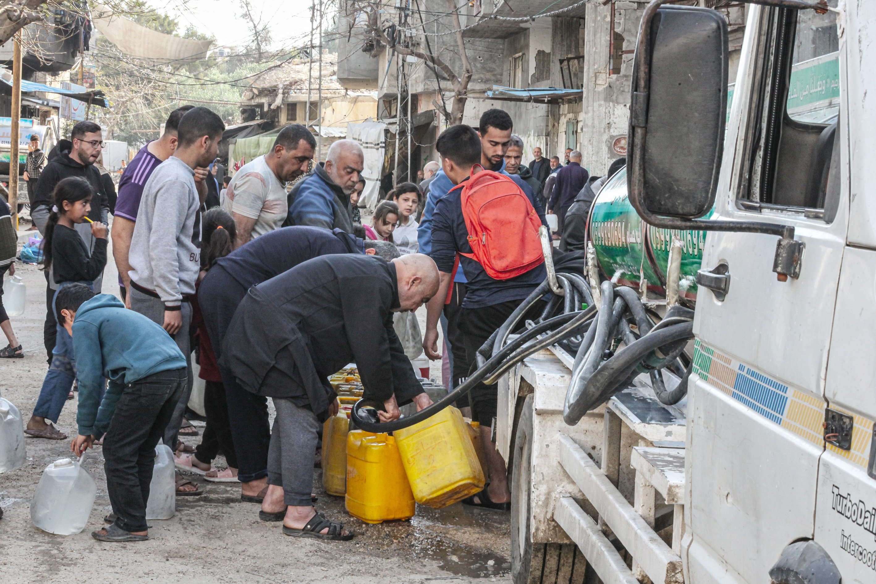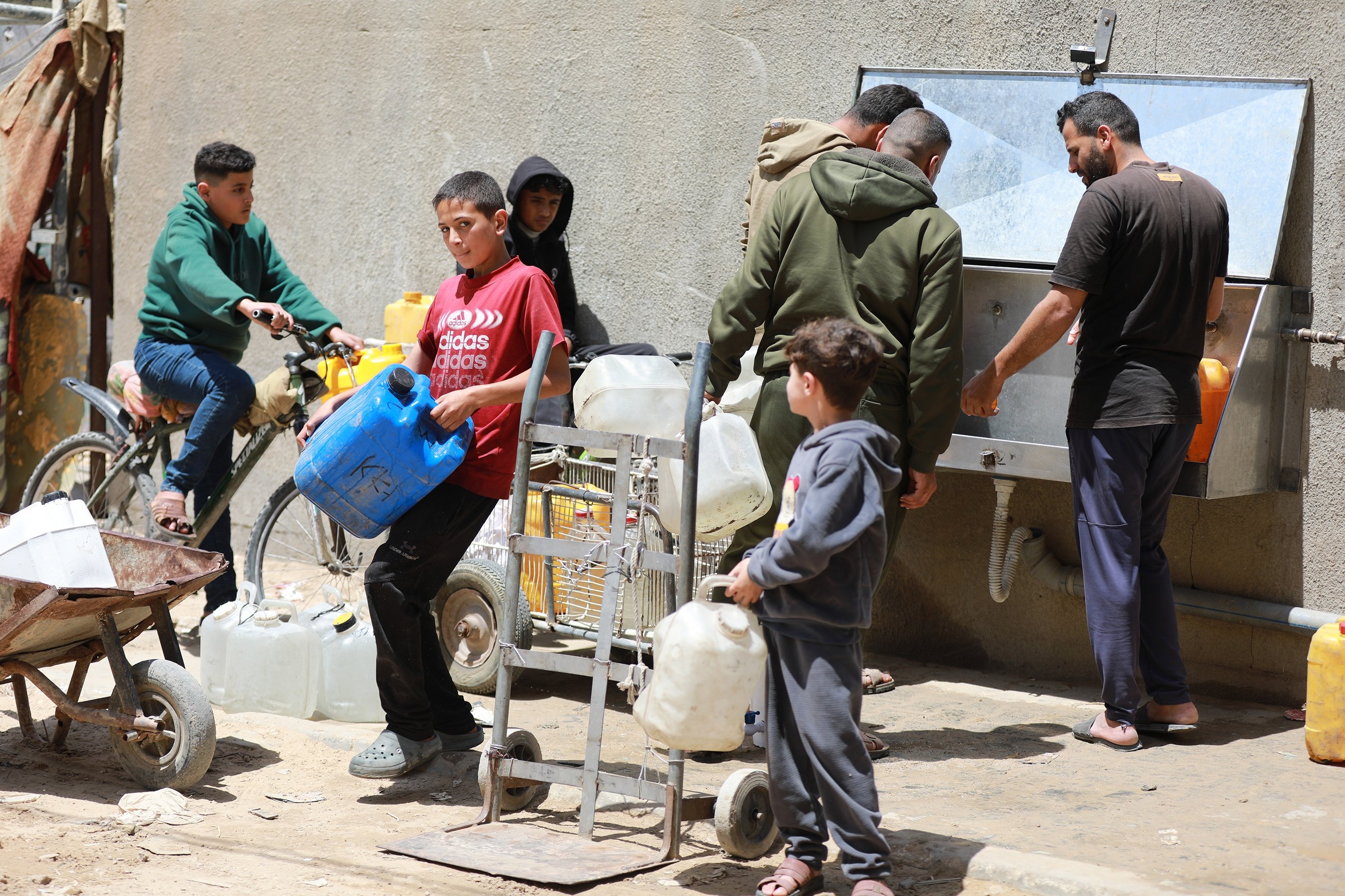 Displaced people collect water from tanker trucks in the Bureij camp, as residents fill containers and carry them to their tents amid severe infrastructure damage and water shortages caused by Israeli attacks in the Gaza Strip, Palestine, April 28, 2026.