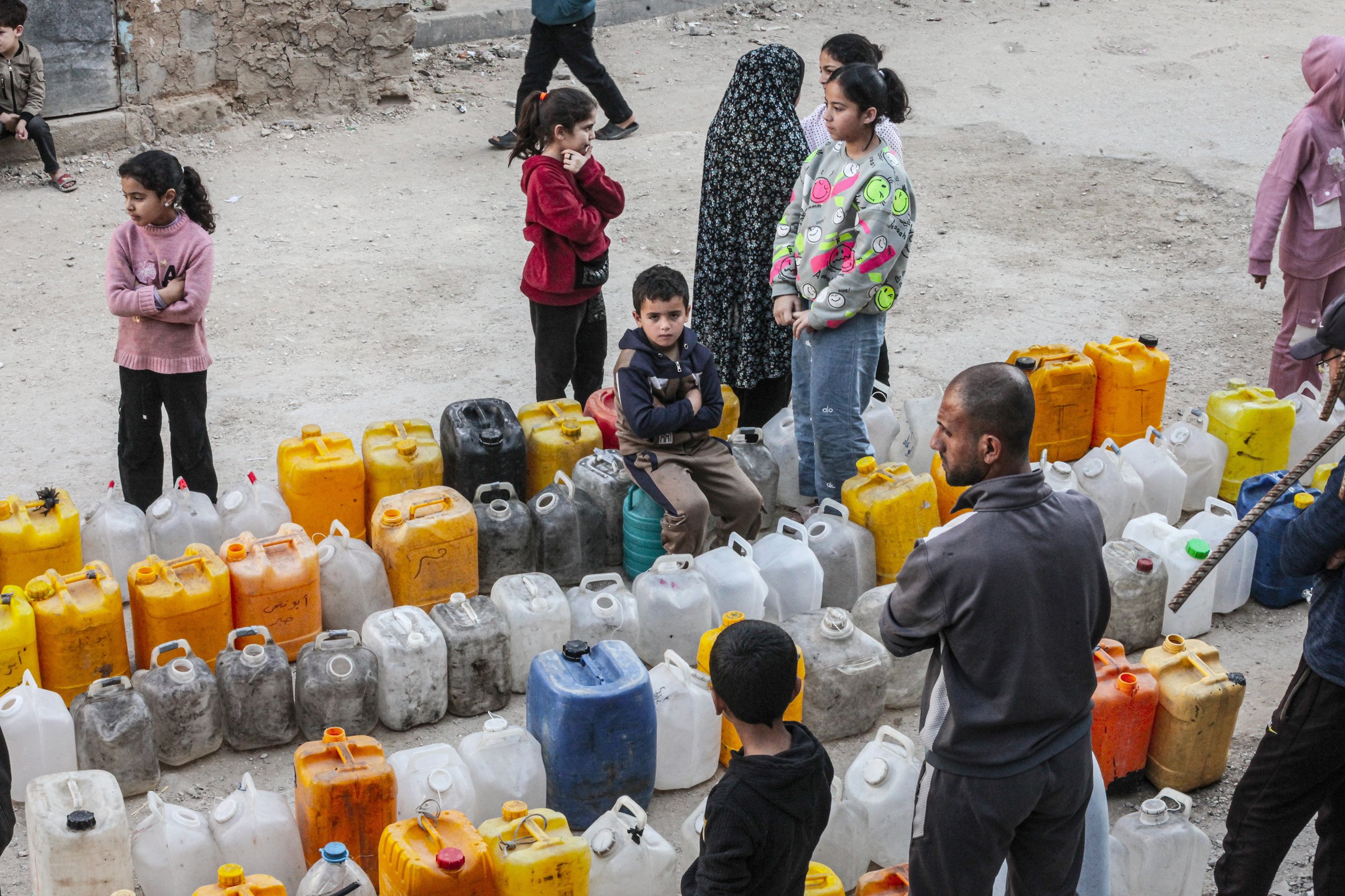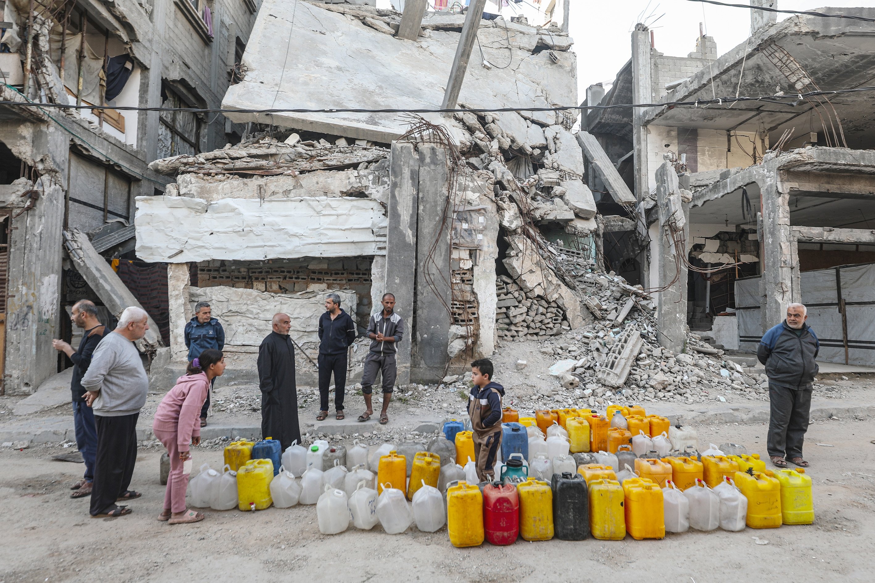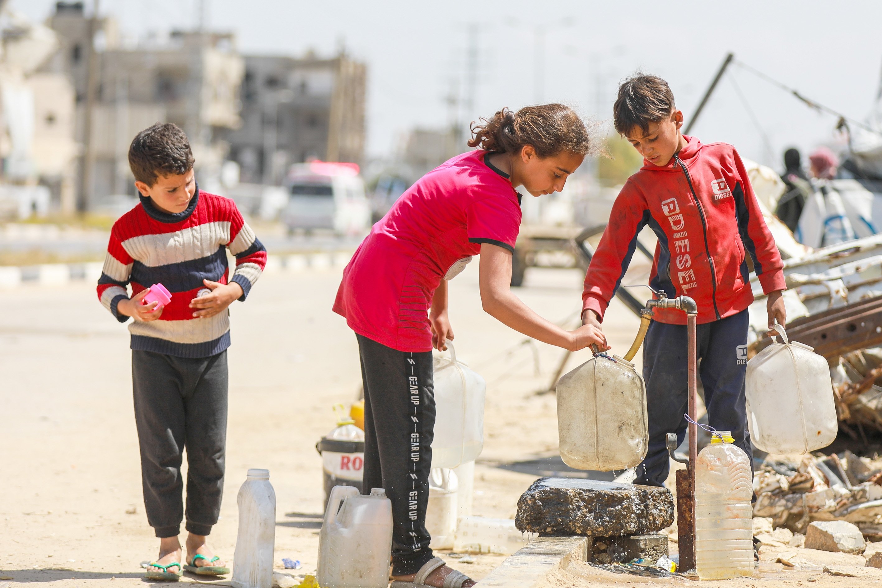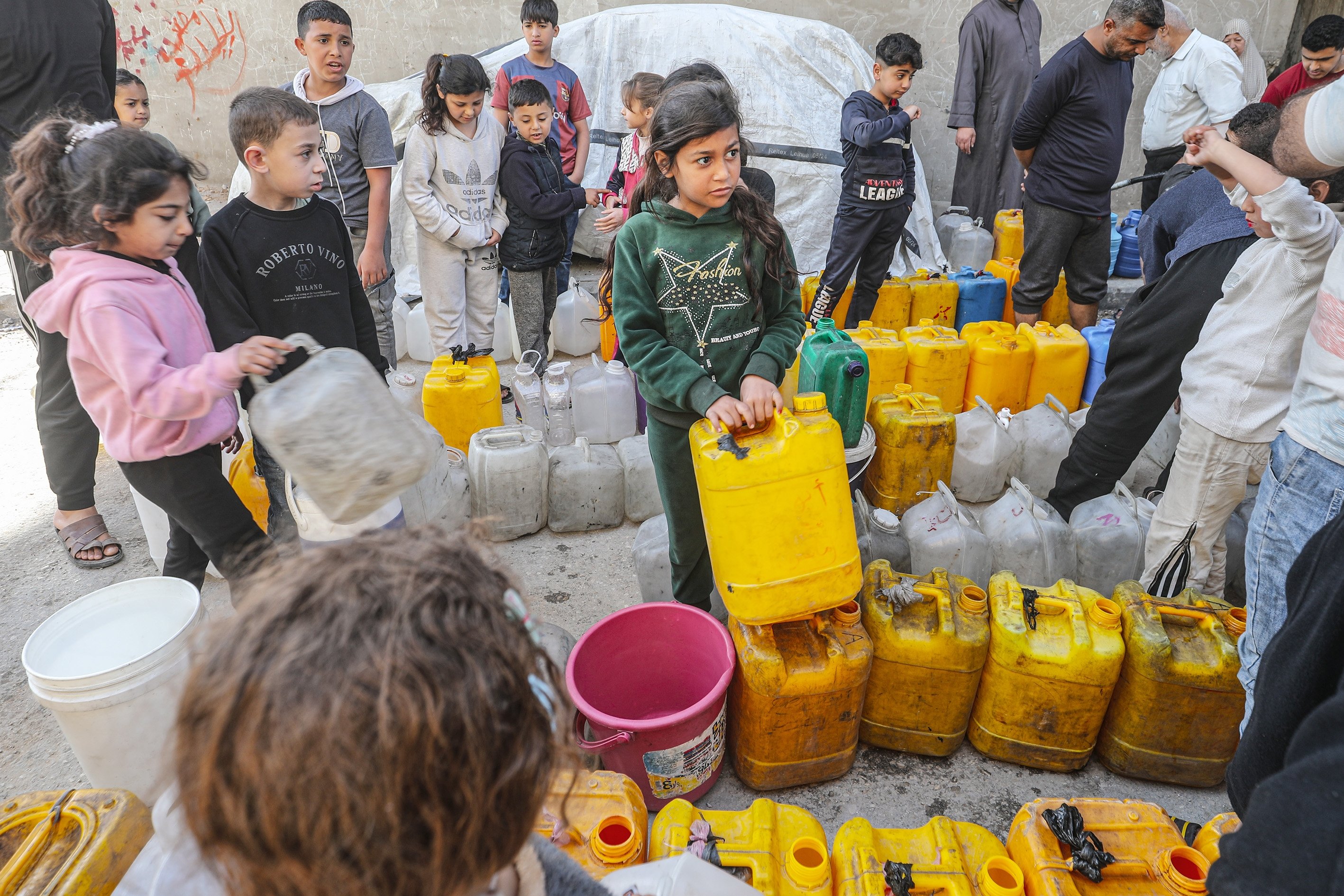 Displaced people collect water from tanker trucks in the Bureij camp, as residents fill containers and carry them to their tents amid severe infrastructure damage and water shortages caused by Israeli attacks in the Gaza Strip, Palestine, April 28, 2026.