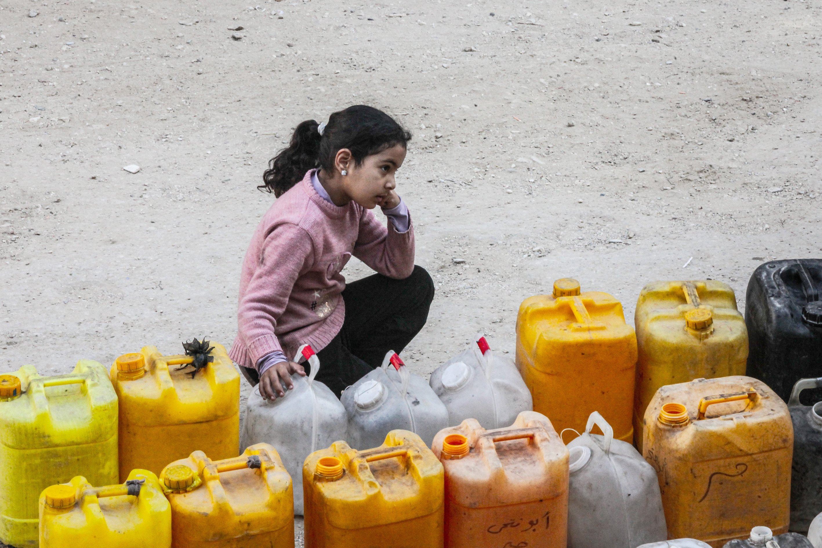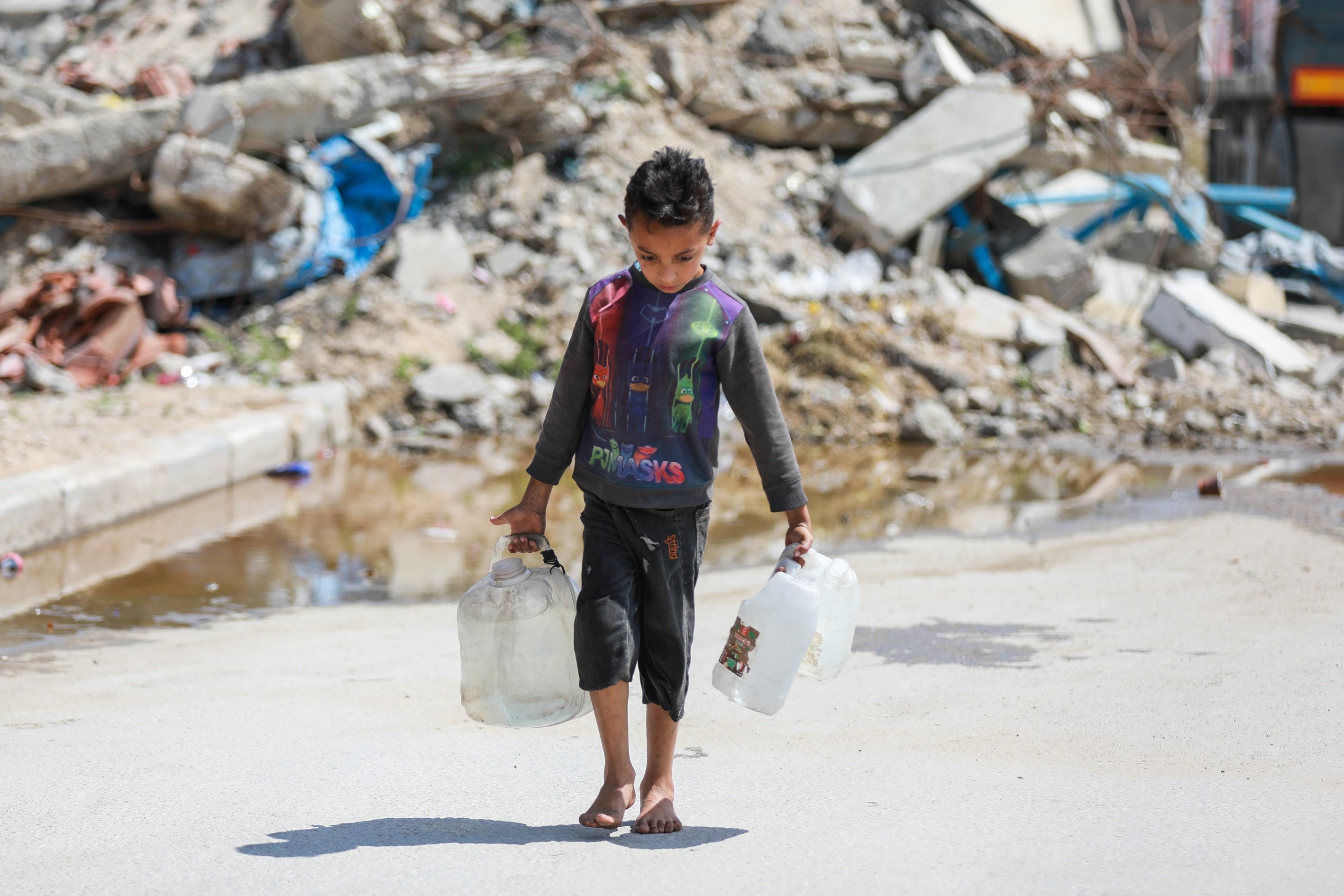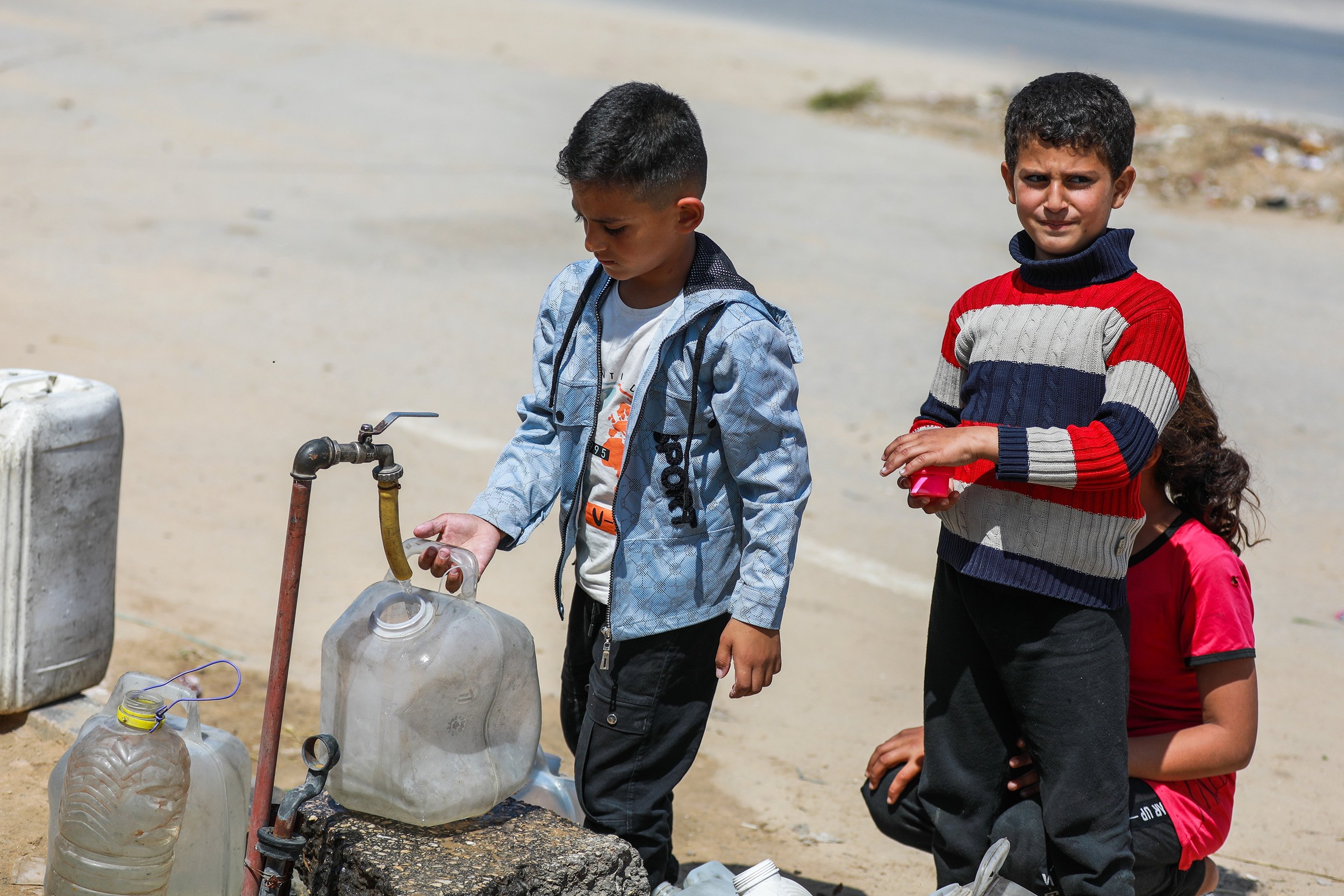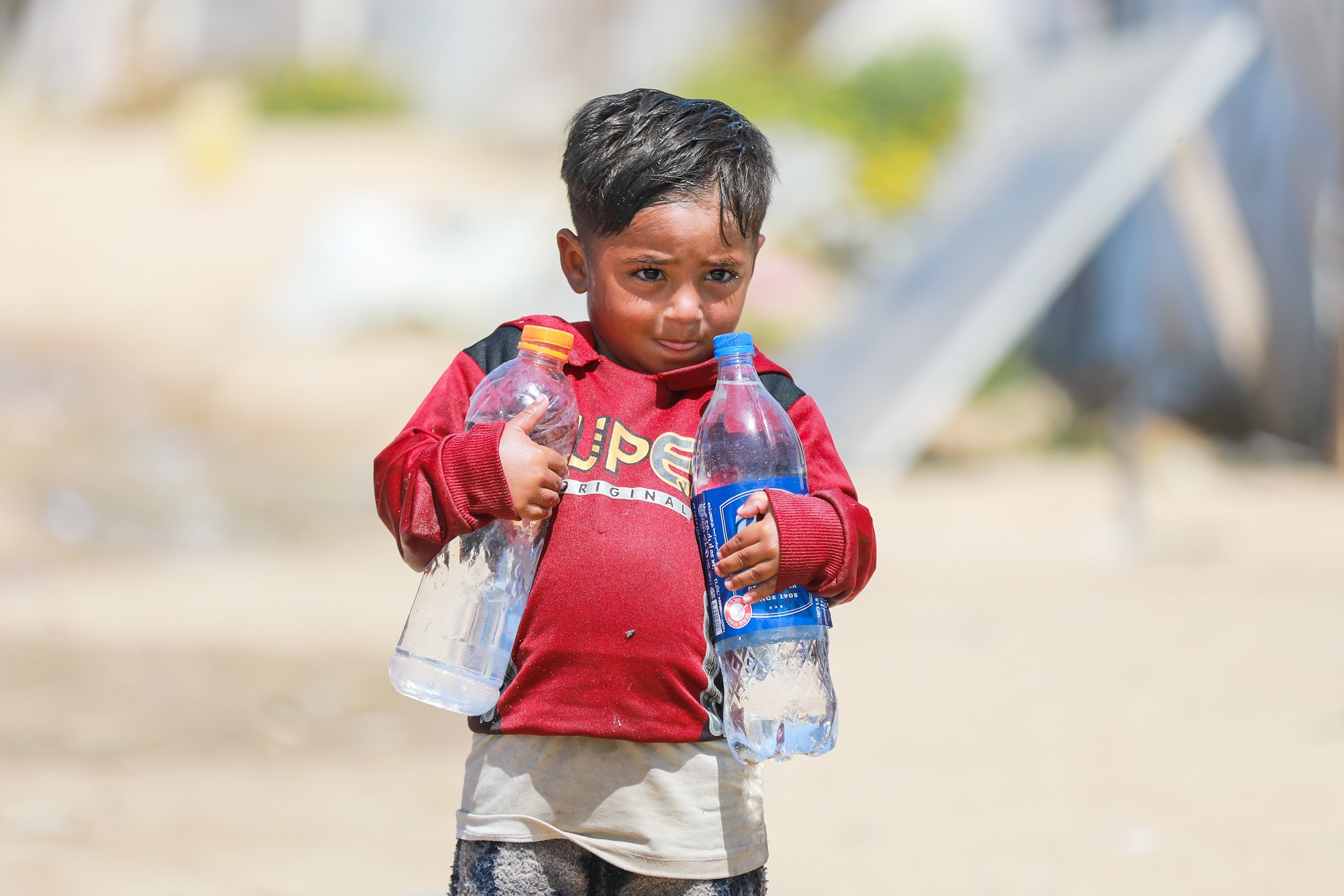 Displaced people collect water from tanker trucks in the Bureij camp, as residents fill containers and carry them to their tents amid severe infrastructure damage and water shortages caused by Israeli attacks in the Gaza Strip, Palestine, April 28, 2026.