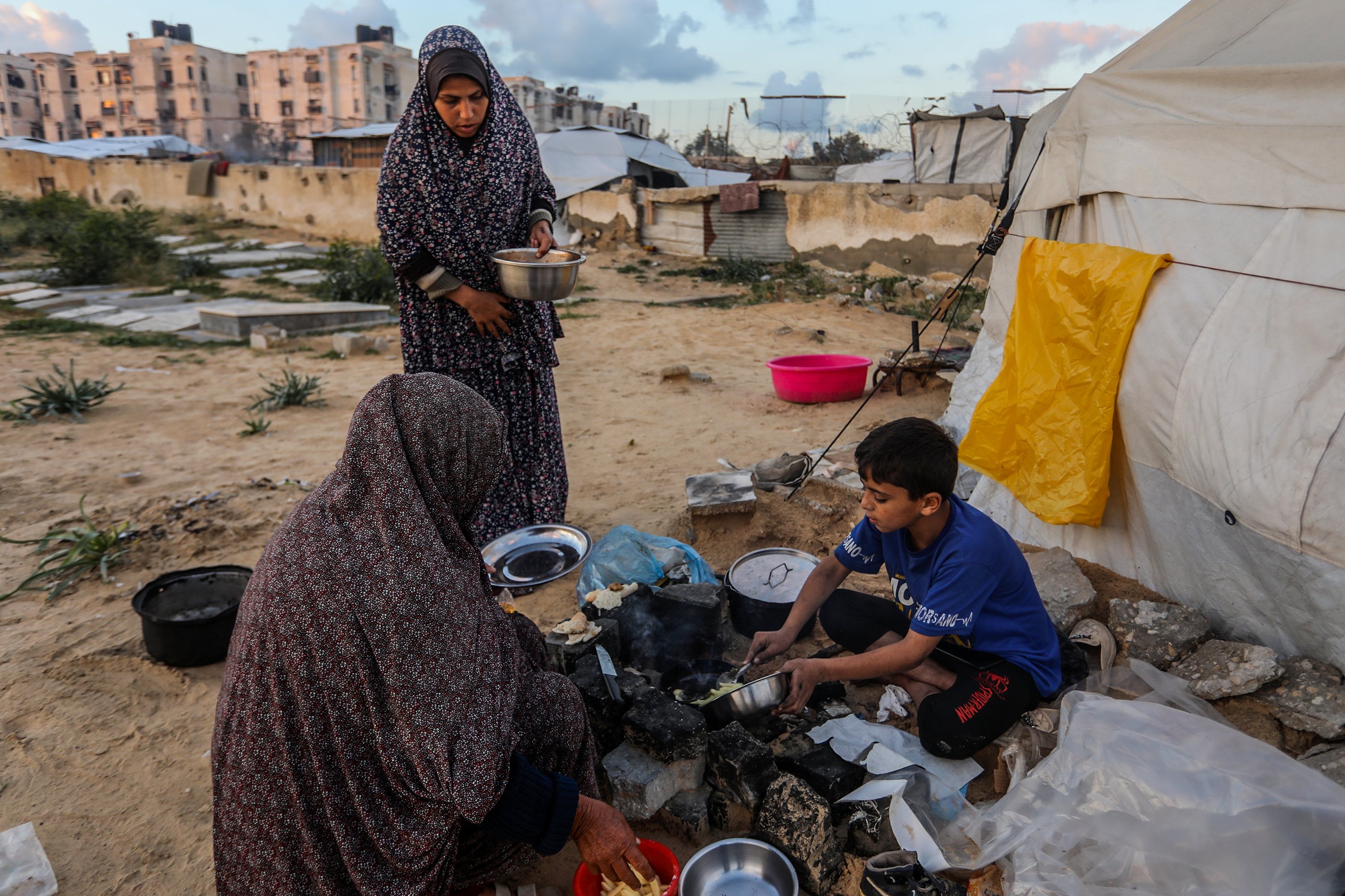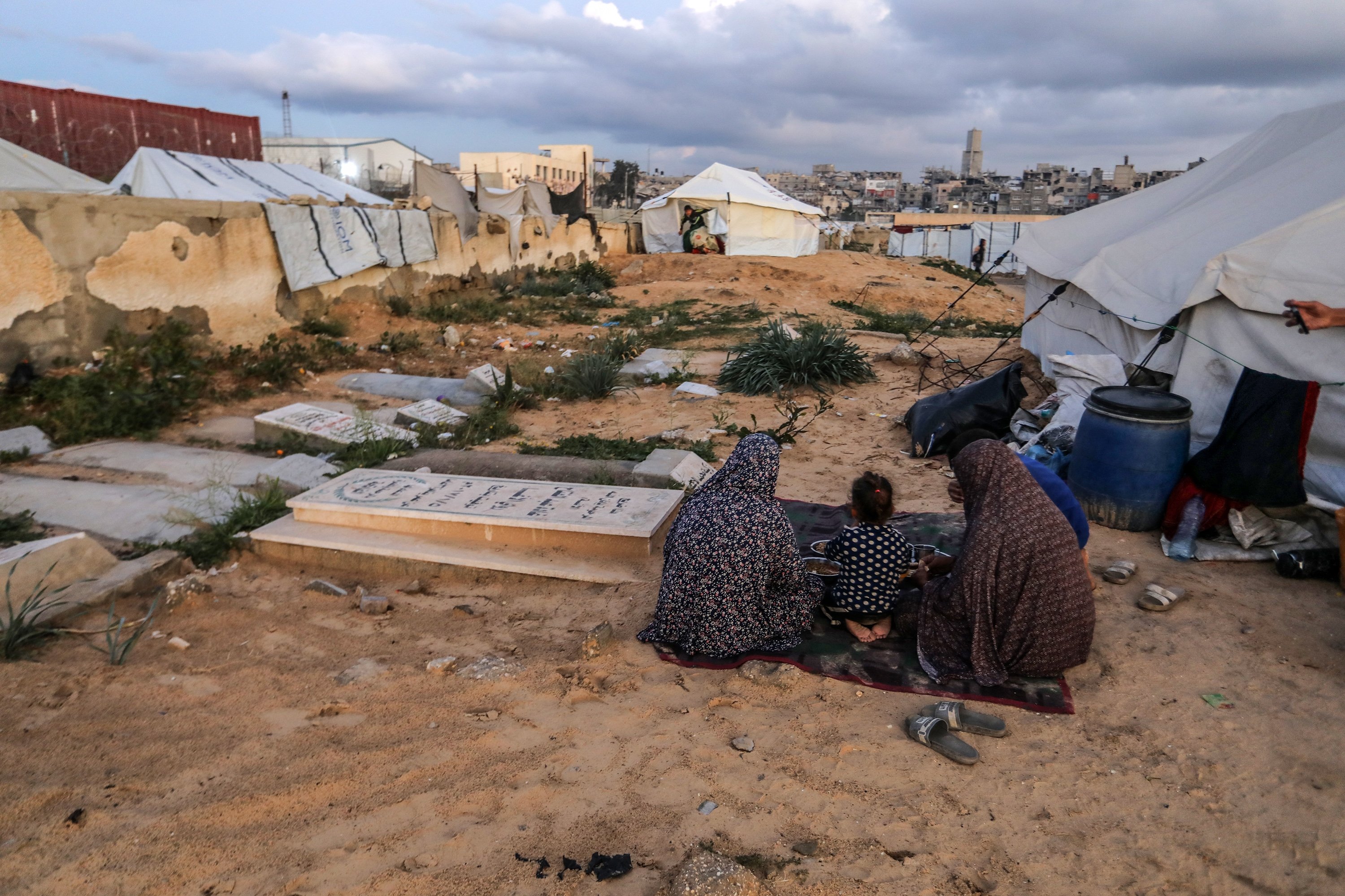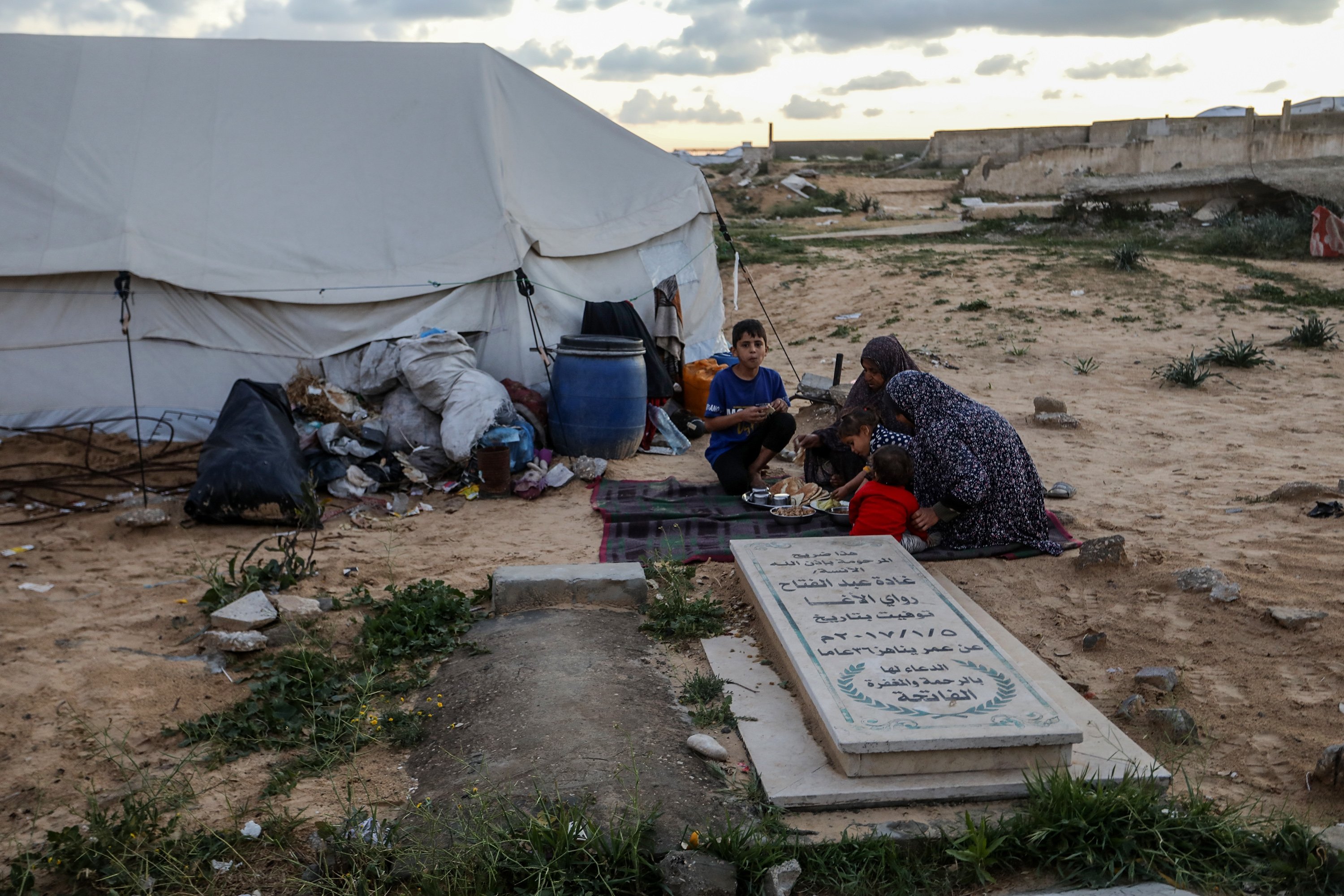 A displaced family shelters in a makeshift tent set up beside graves in a cemetery, struggling to survive with limited access to food and water as they prepare a modest iftar during Ramadan, in Khan Younis, southern Gaza Strip, Palestine, Feb. 25, 2026.