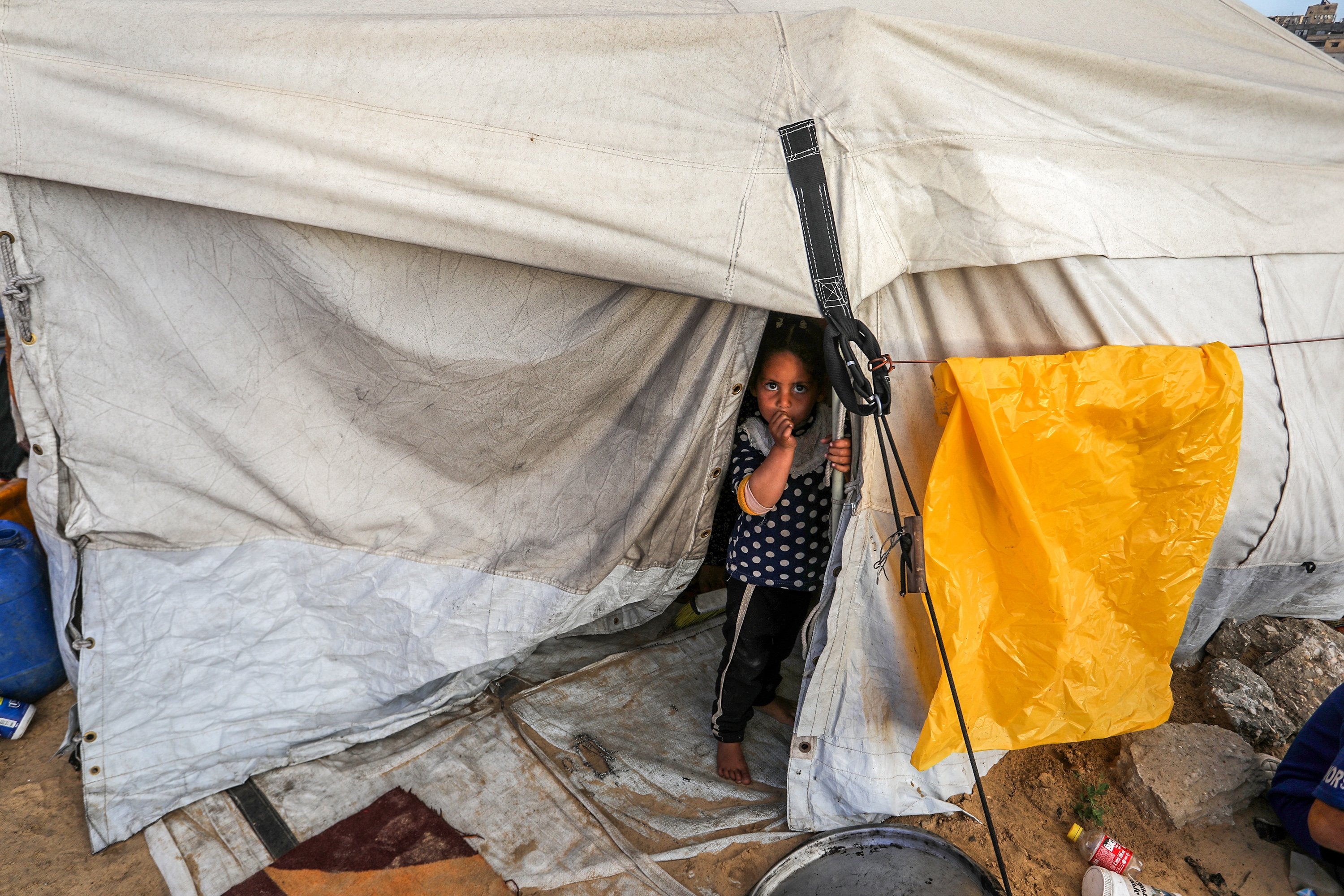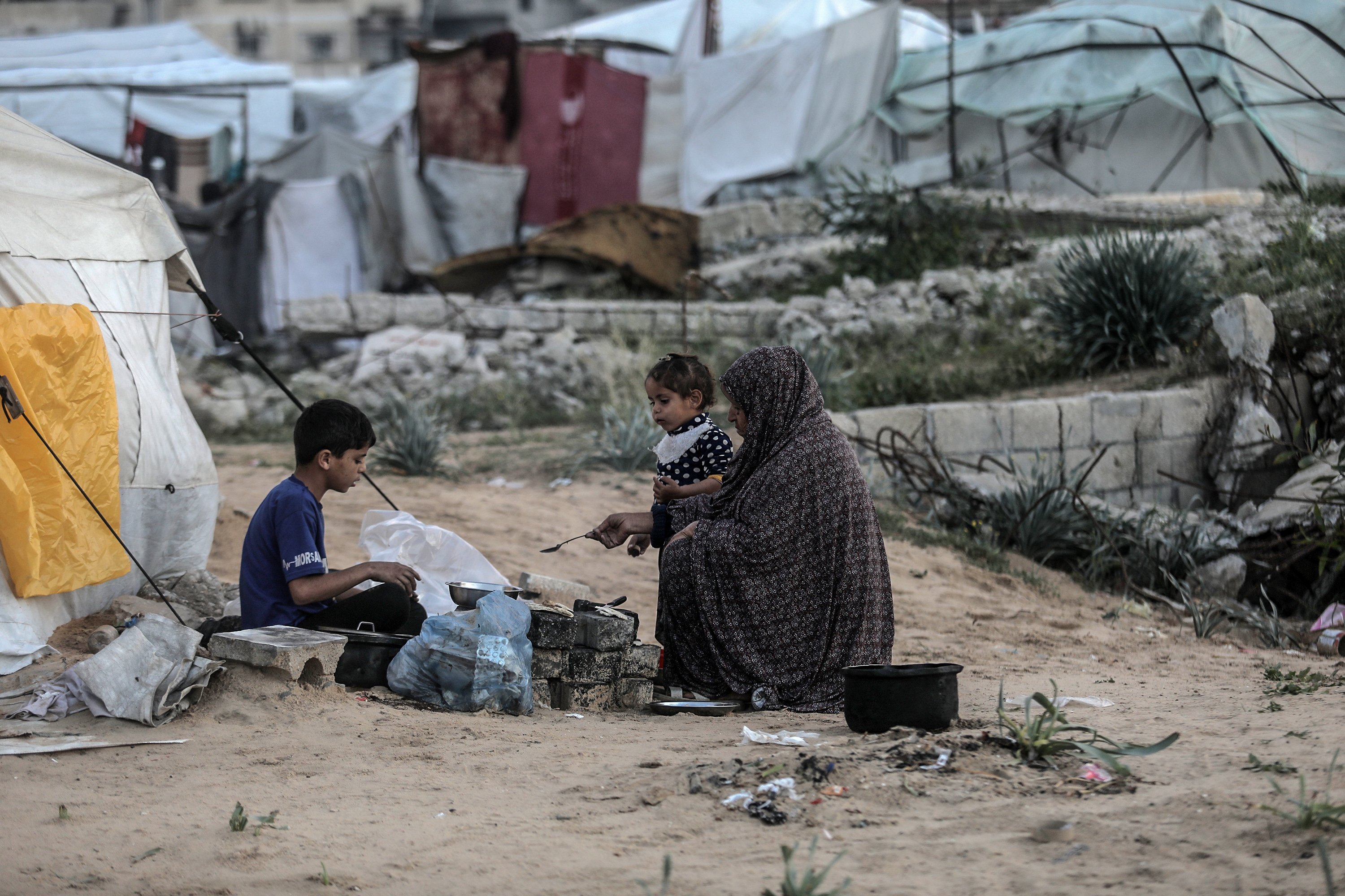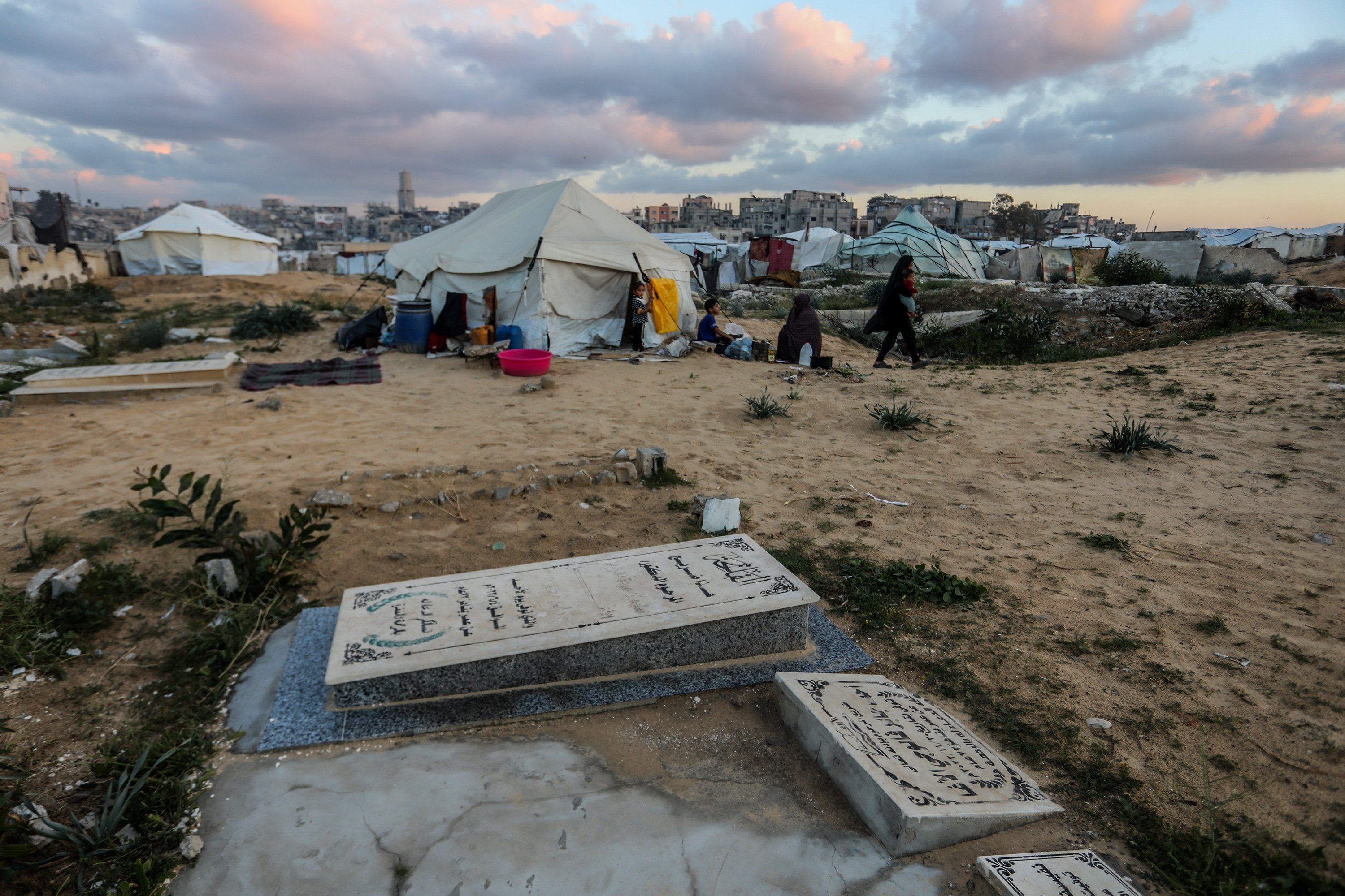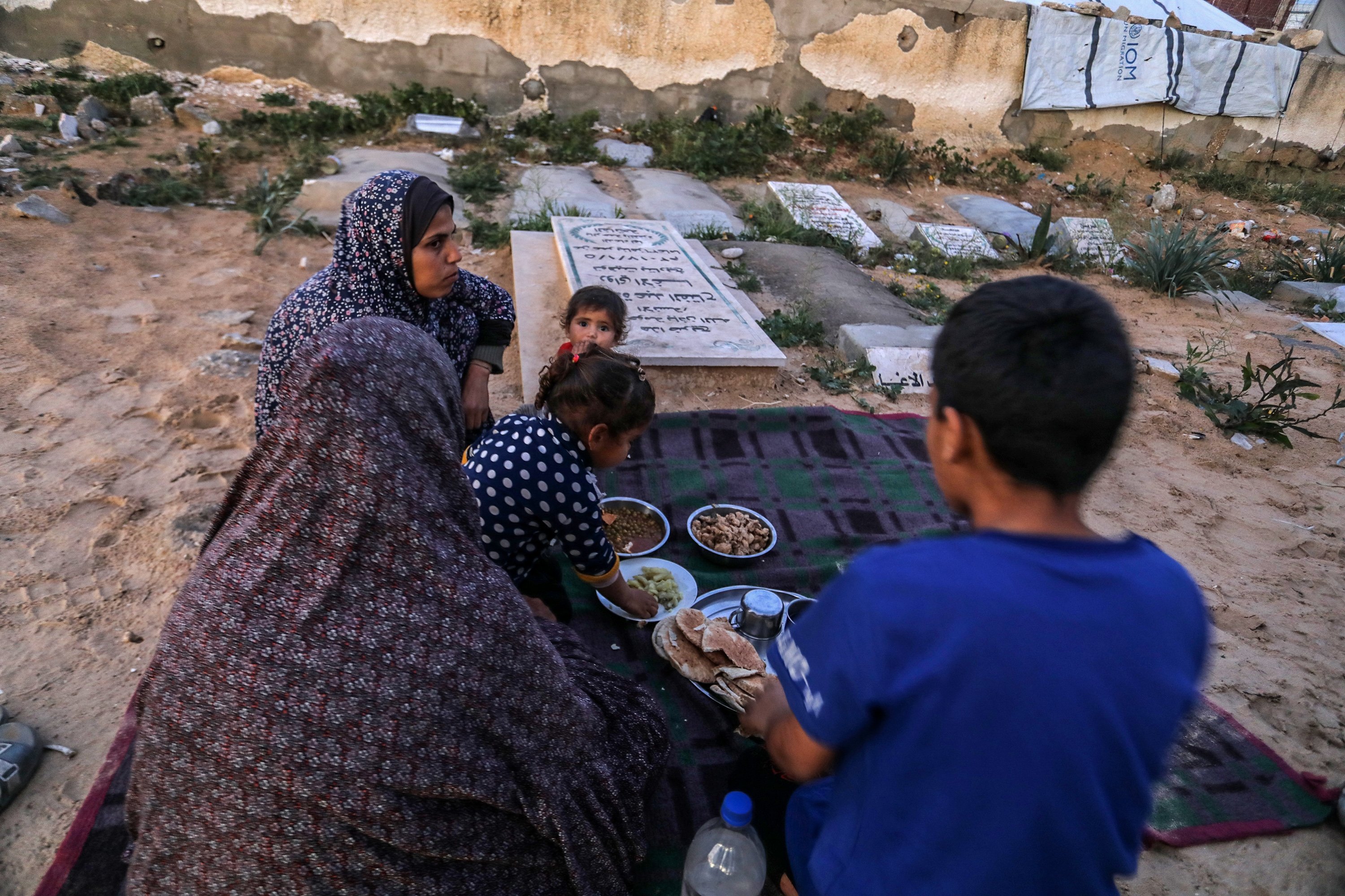 A displaced family shelters in a makeshift tent set up beside graves in a cemetery, struggling to survive with limited access to food and water as they prepare a modest iftar during Ramadan, in Khan Younis, southern Gaza Strip, Palestine, Feb. 25, 2026.