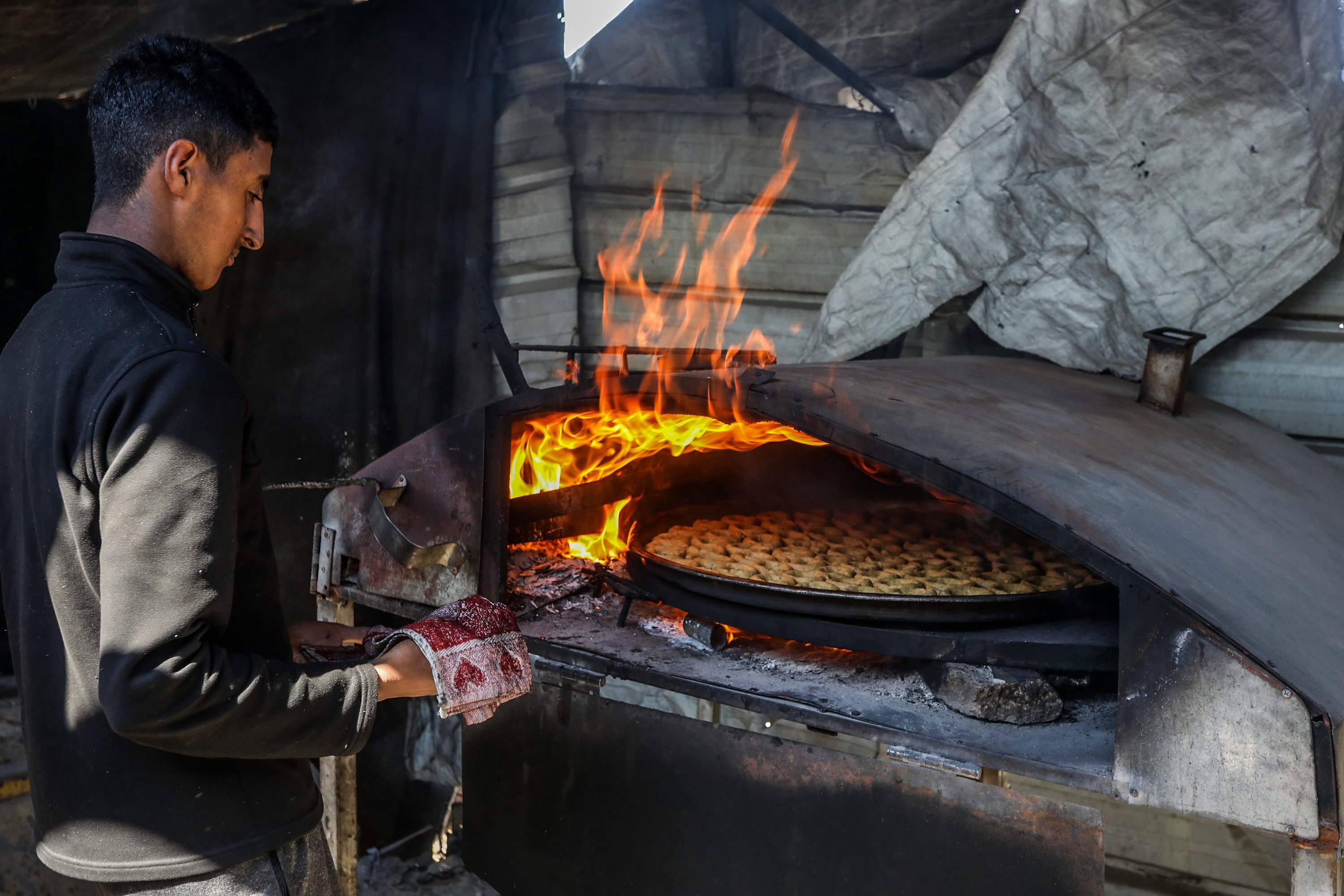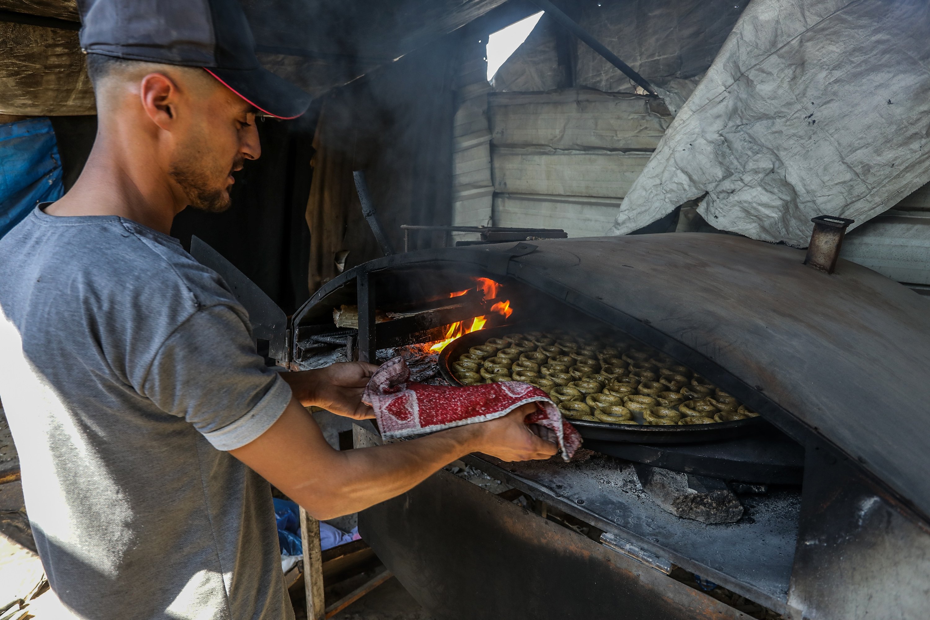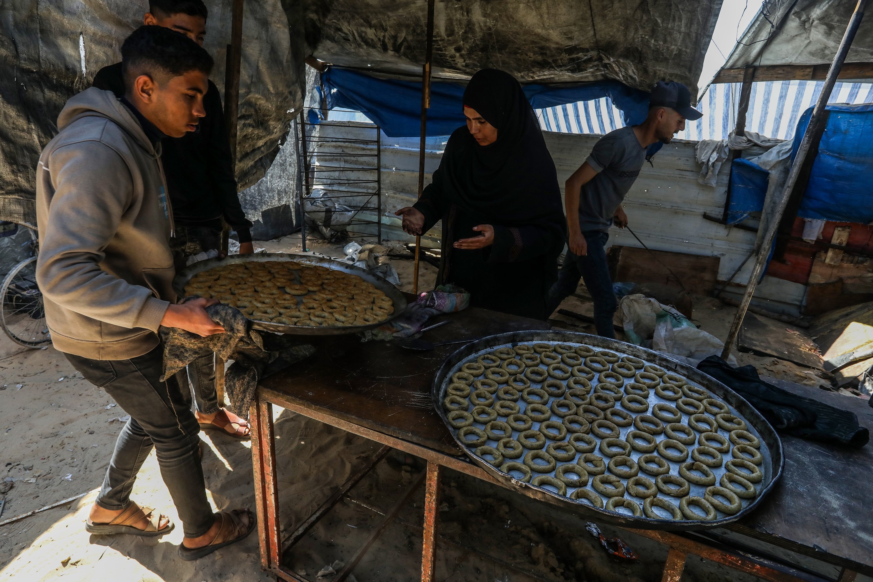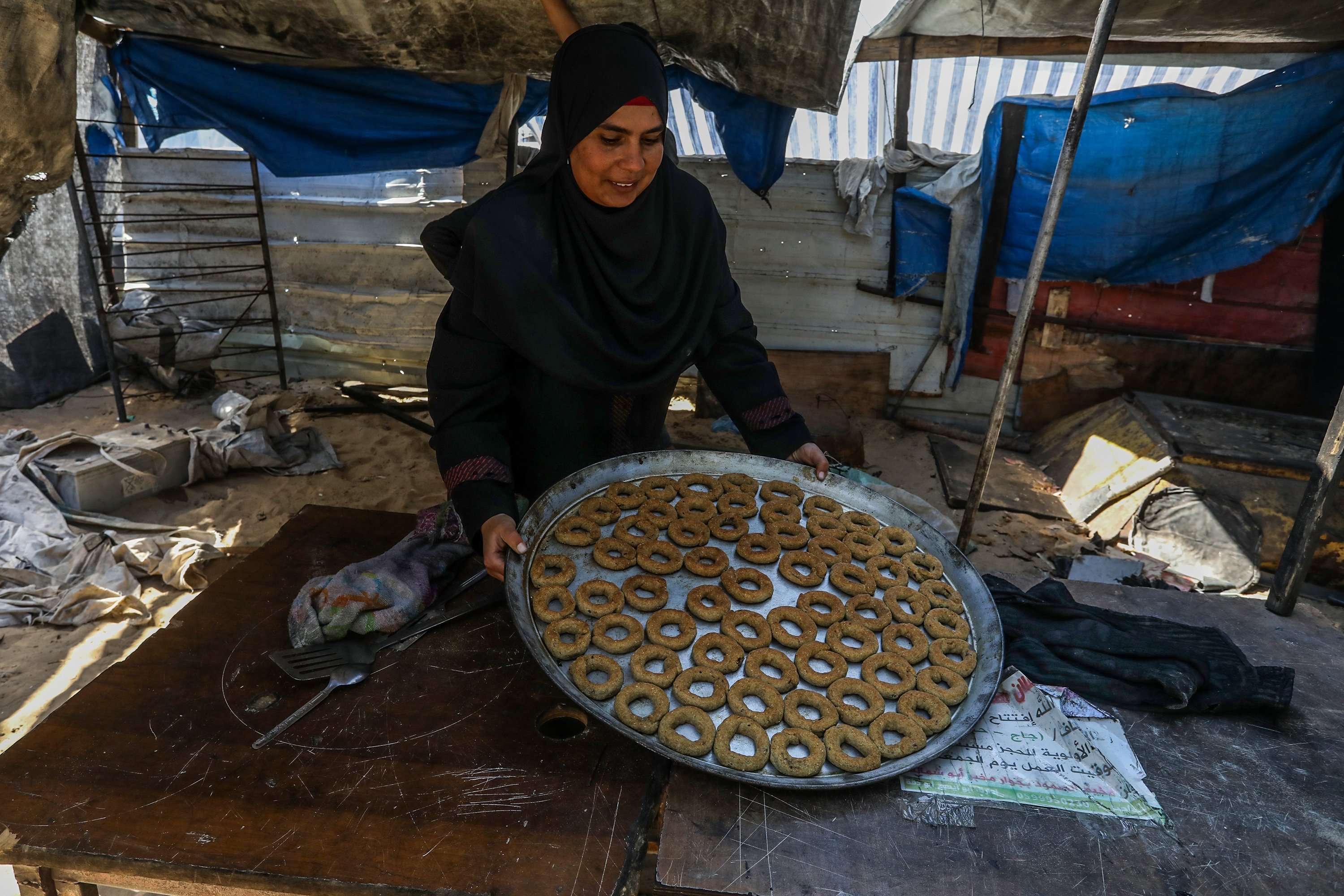Displaced Palestinian women bake Eid cookies in Gaza tent camp