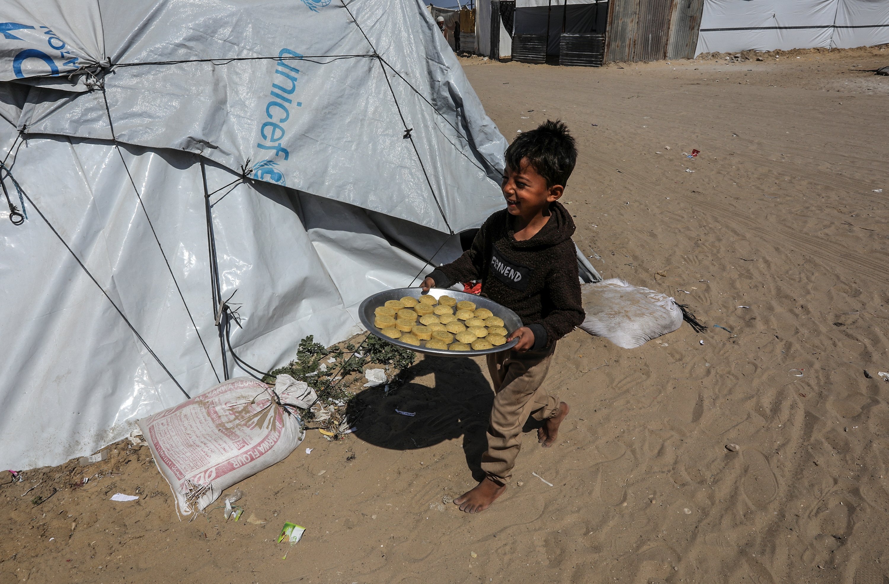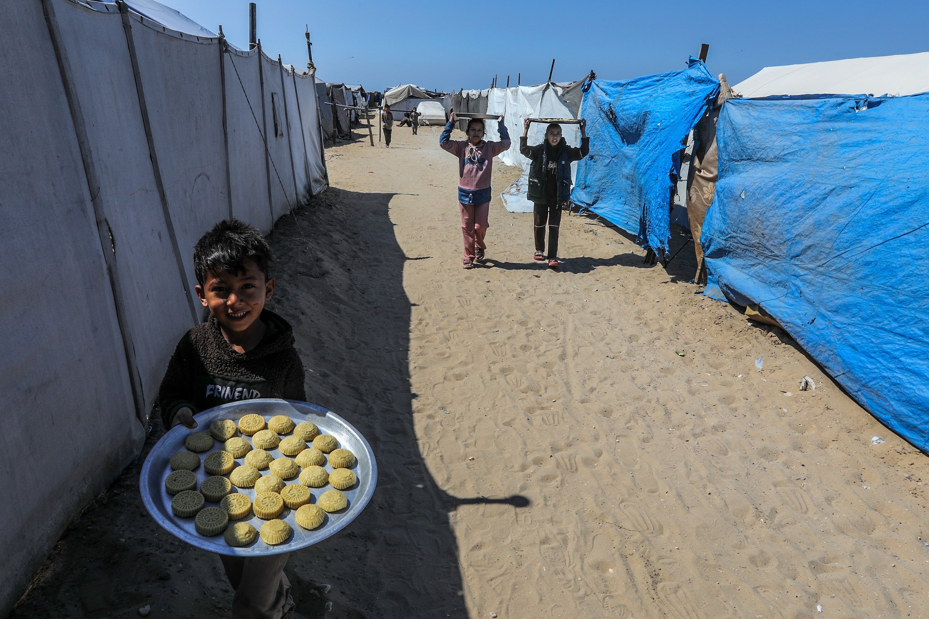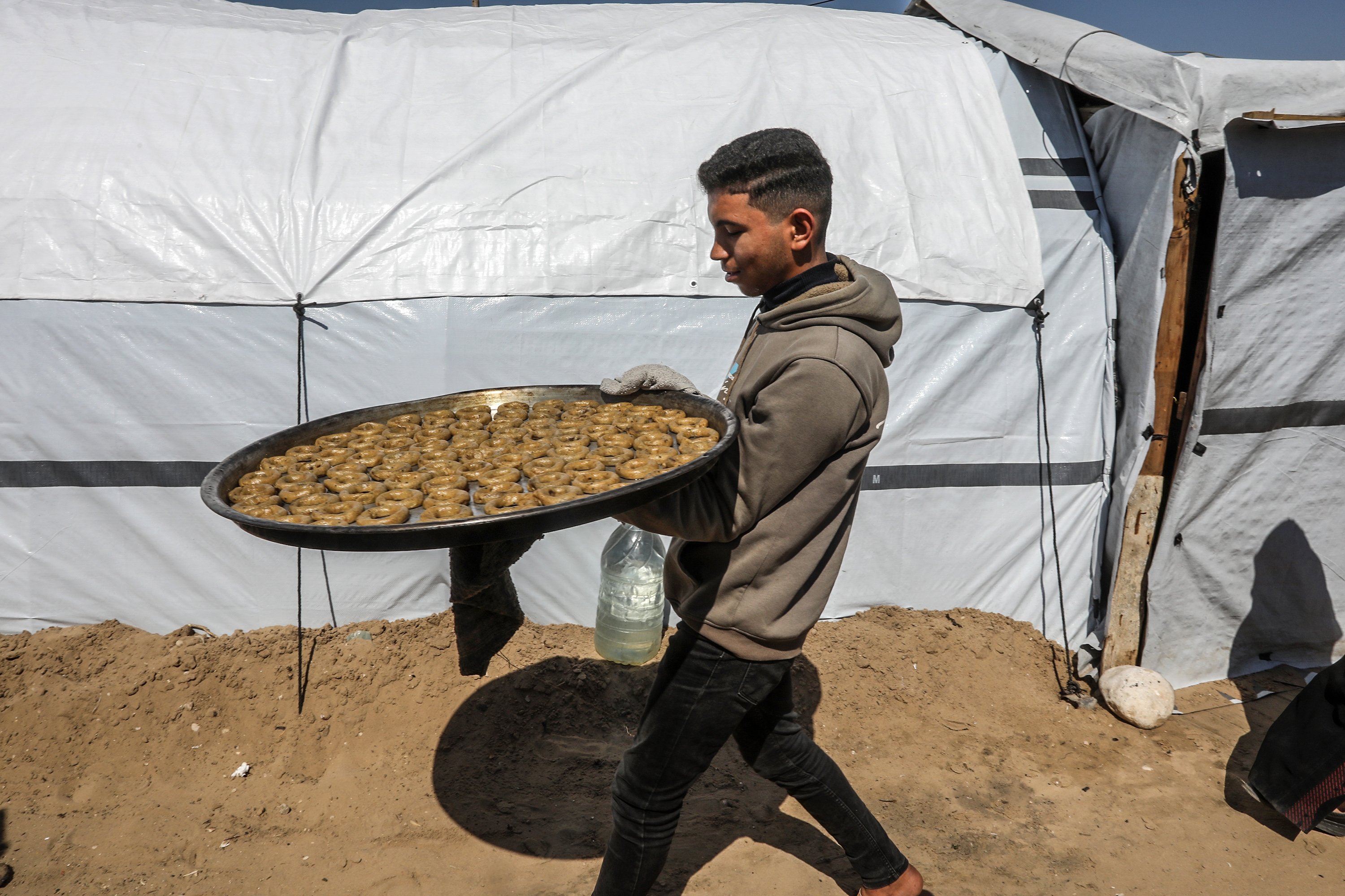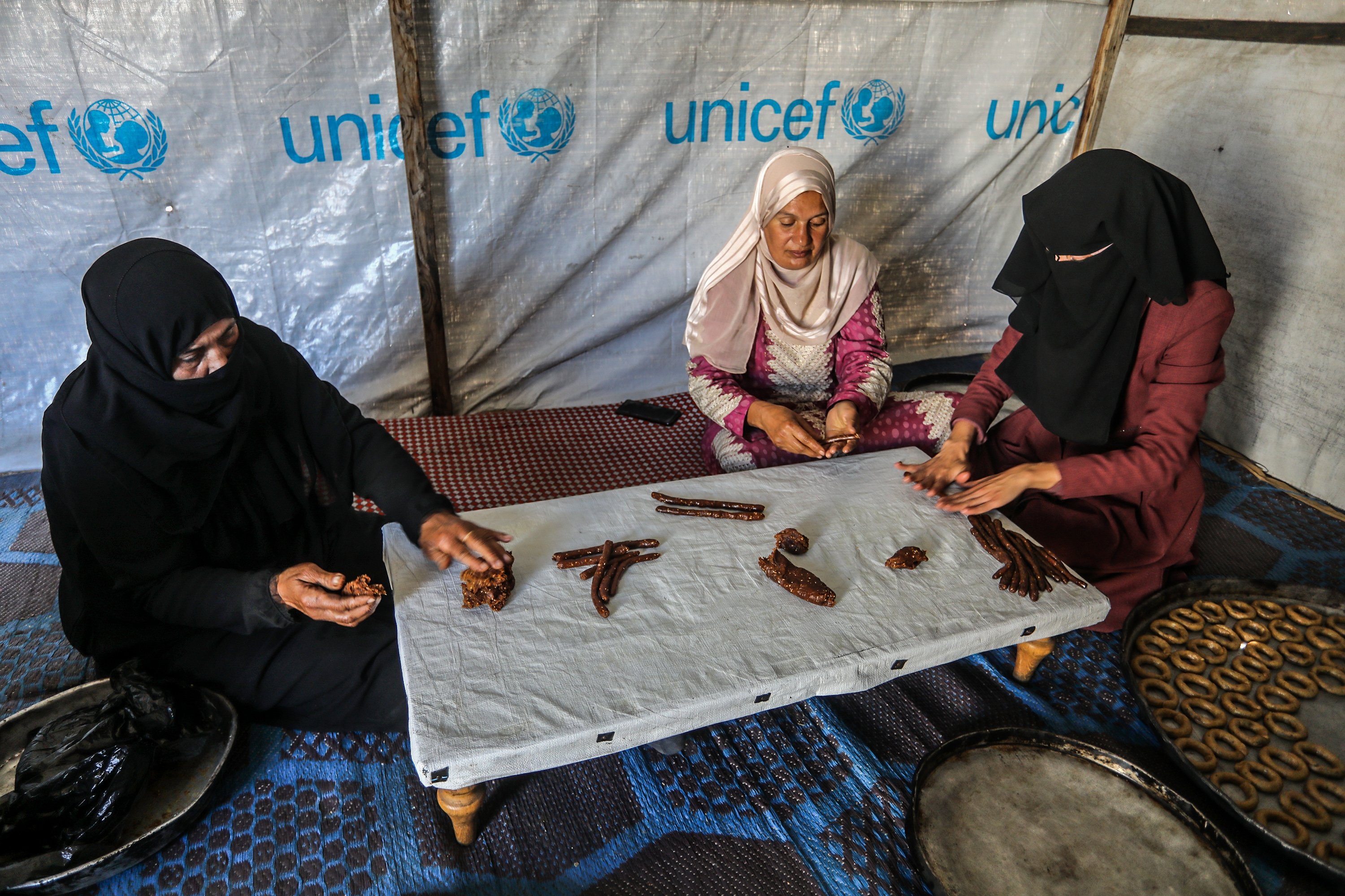 Displaced Palestinian women bake Eid cookies in Gaza tent camp