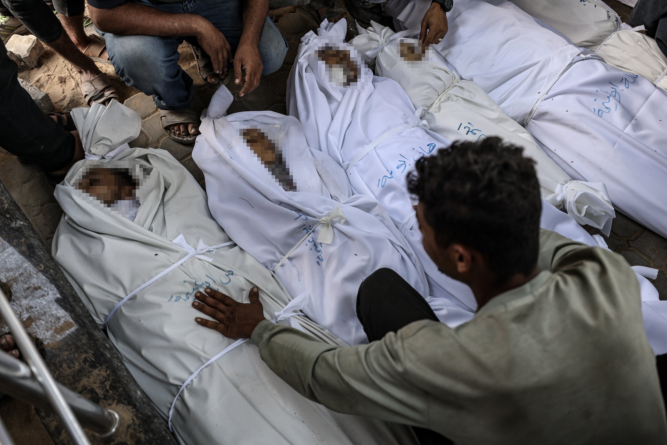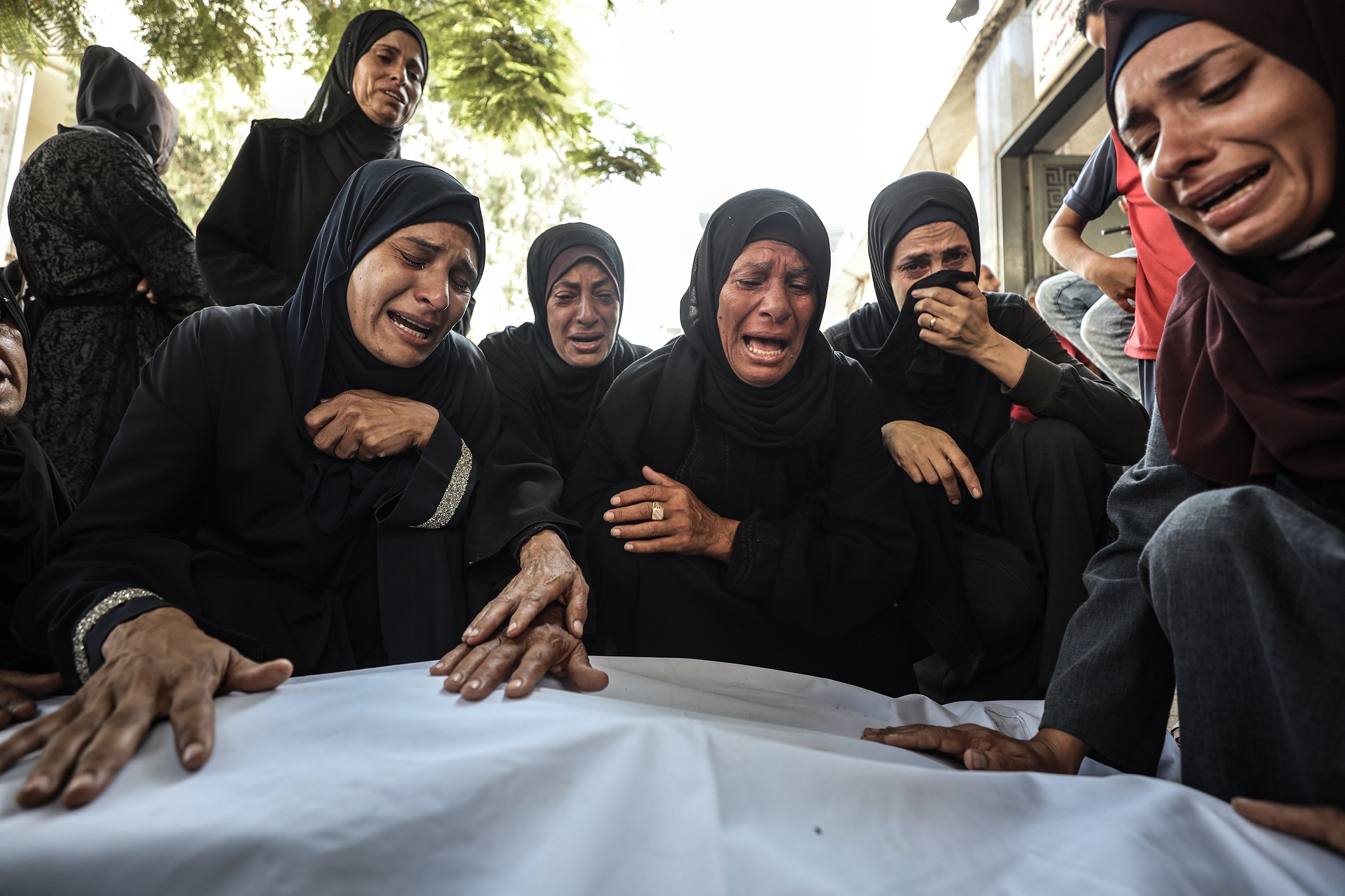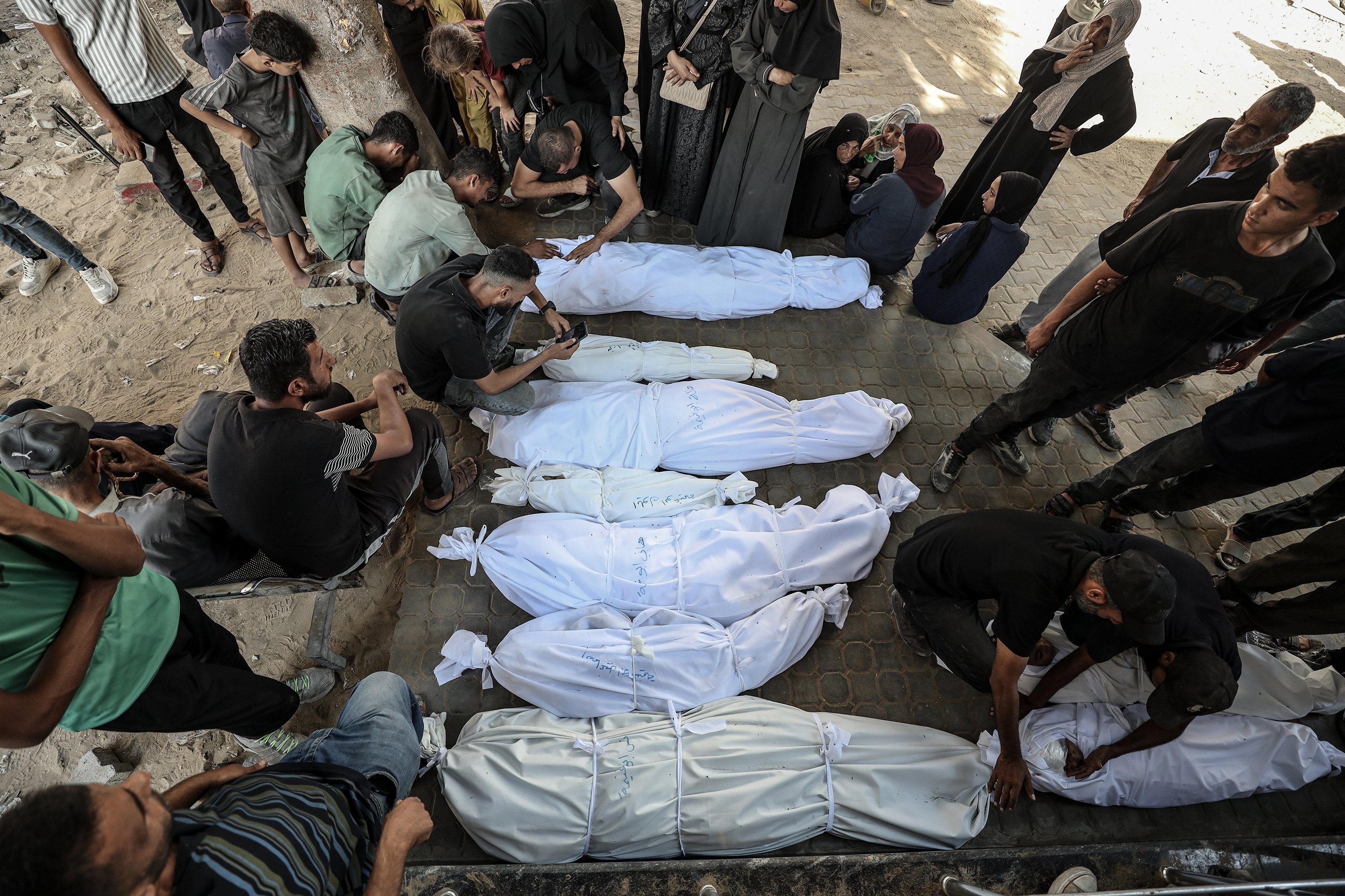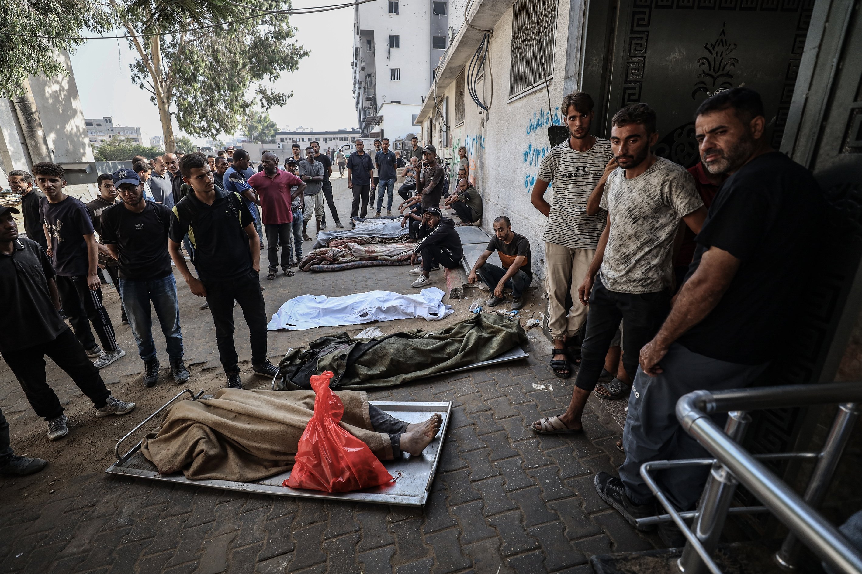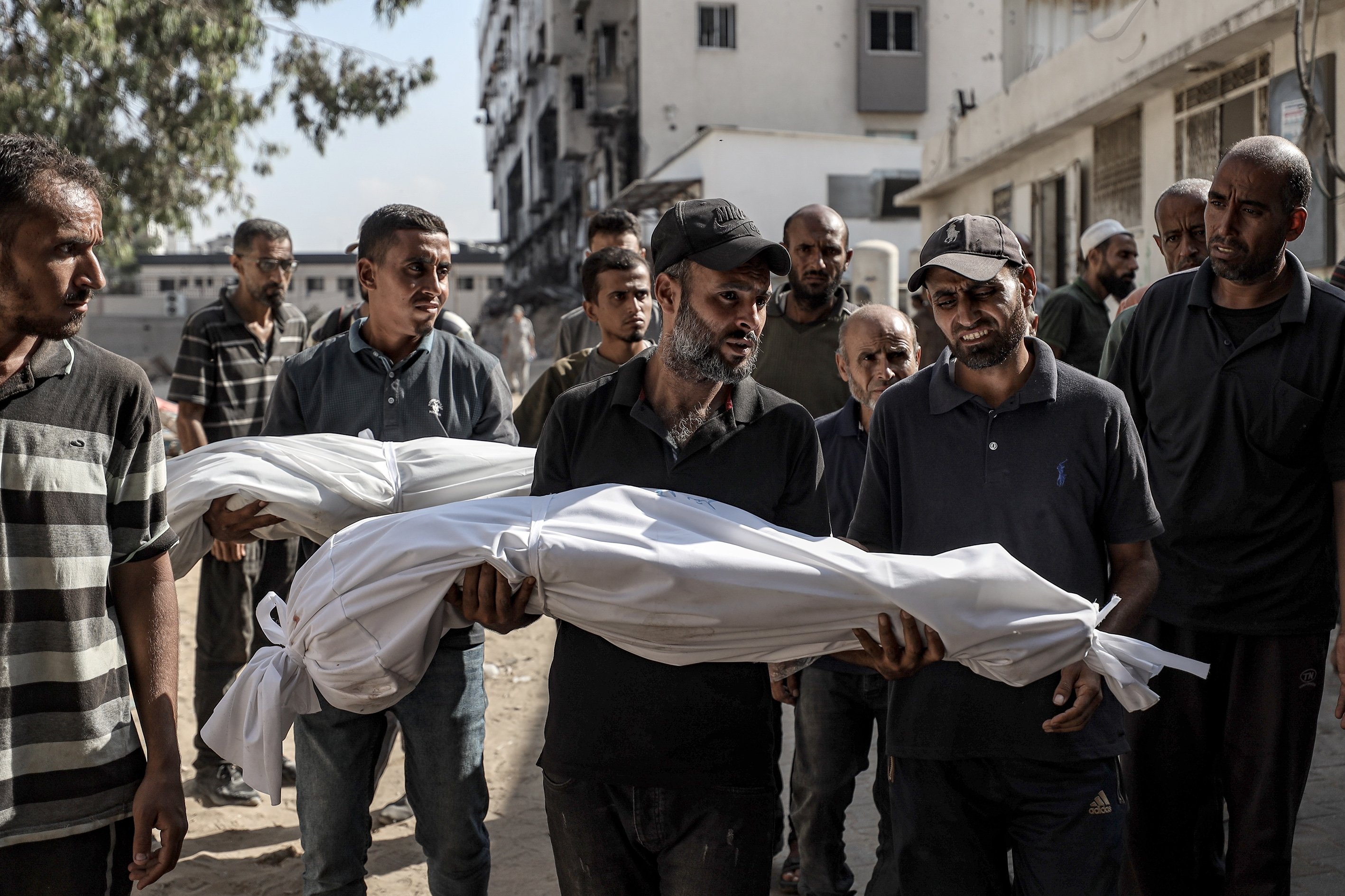 Bodies of Palestinian people killed in Israeli attacks are taken from al-Shifa Hospital for funeral processions in Gaza City, Palestine, Sept. 15, 2025.