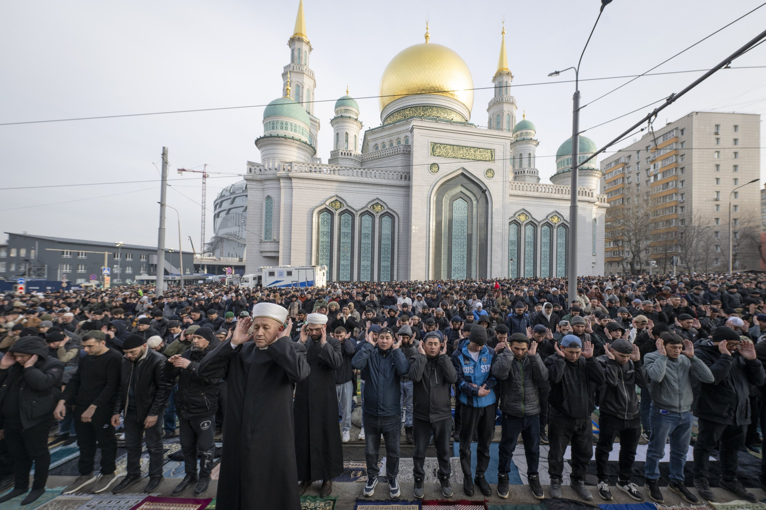 Muslims gather to perform Eid al-Fitr prayer at a mosque, Moscow, Russia, March 20, 2026.